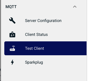 To launch the Chariot MQTT Client, first log into the Chariot MQTT server web front-end. Then click on the MQTT Client View under Main Nav → MQTT → Test Client on the Chariot left-hand navigation pane.