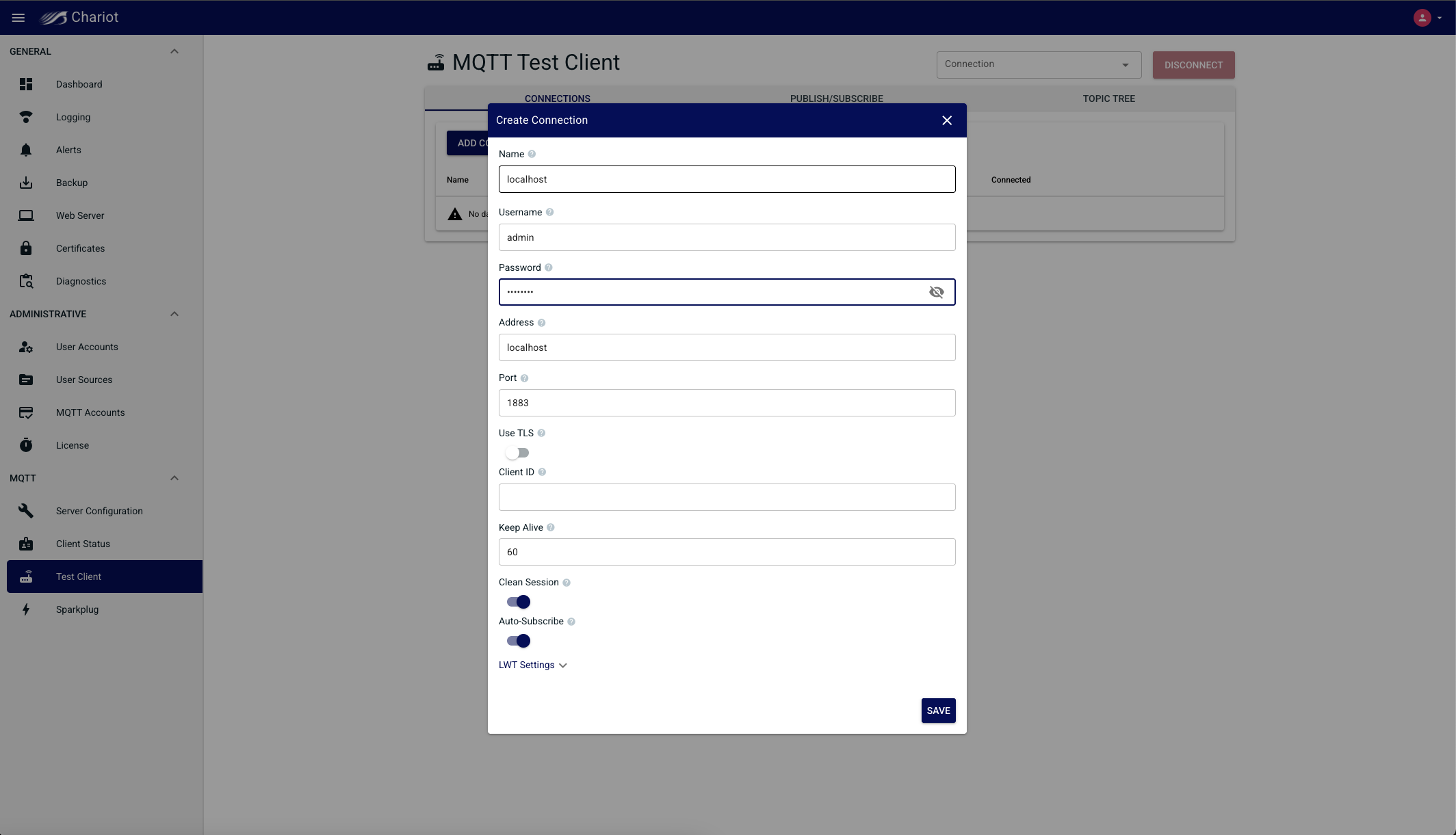 To get started, navigate to the Connections tab and add a server connection by clicking on the Add Connection button. Fill out the Connection configuration (MQTT username, password, address/url, port, client id, etc) and then click the Add button. This can be any MQTT server (e.g., test.mosquitto.org). If you do want to connect to the local Chariot MQTT Server using the Chariot MQTT Client, please be sure to turn on the trial timer so the server will accept incoming connections. See our documentation for default MQTT account credentials.