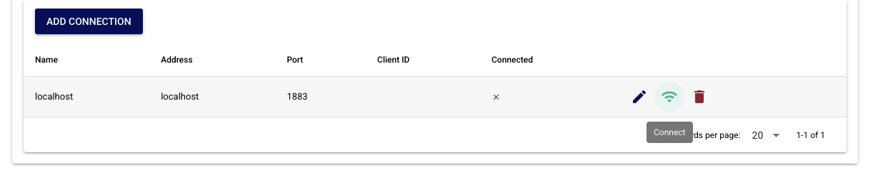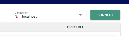 Next, click the connect icon to connect to the newly added MQTT server. Alternatively you can use the dropdown in the header to select from the available connections and clicking on the connect/disconnect buttons. Your current MQTT connection and its state will be displayed in the upper right of the window.