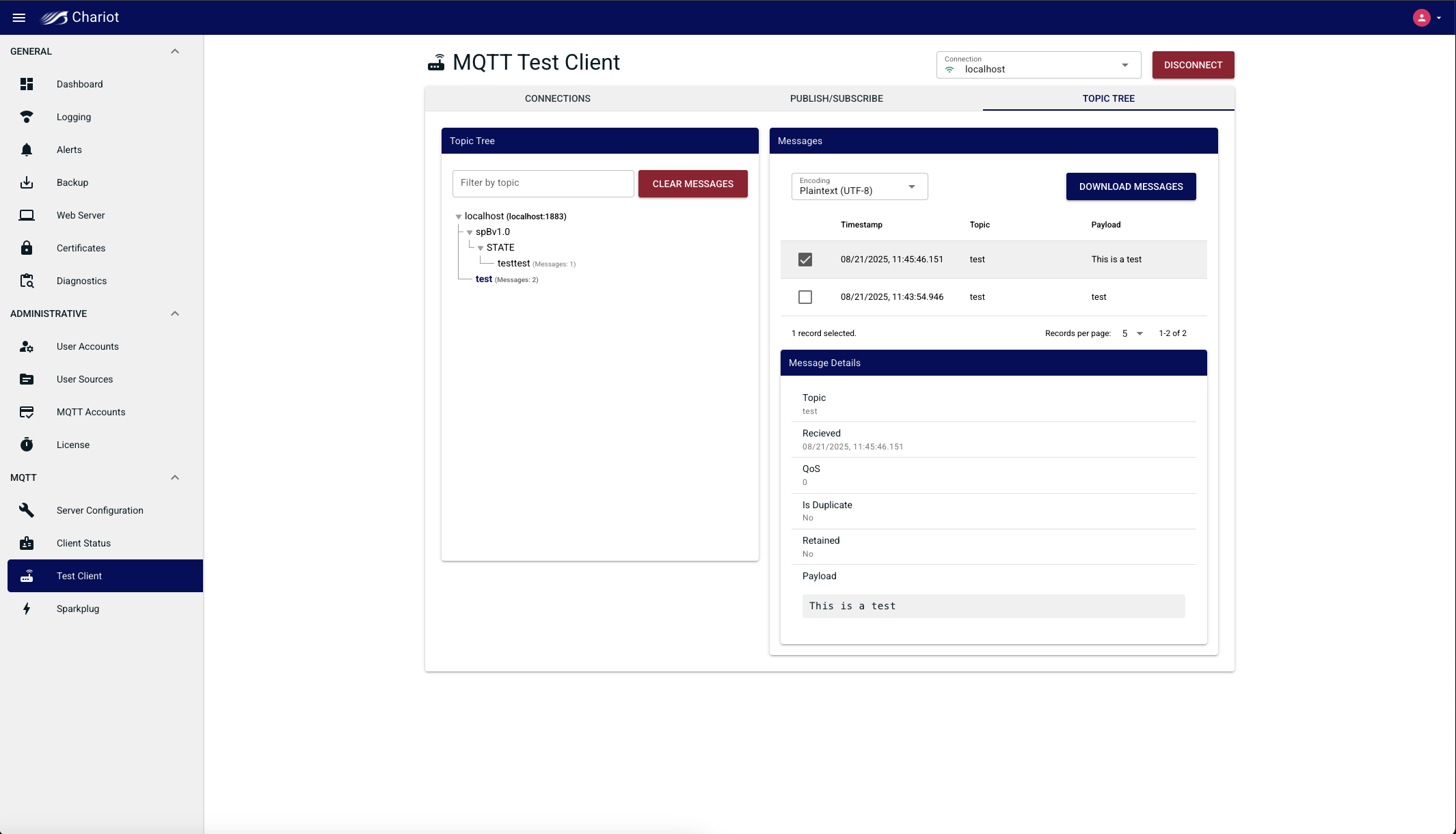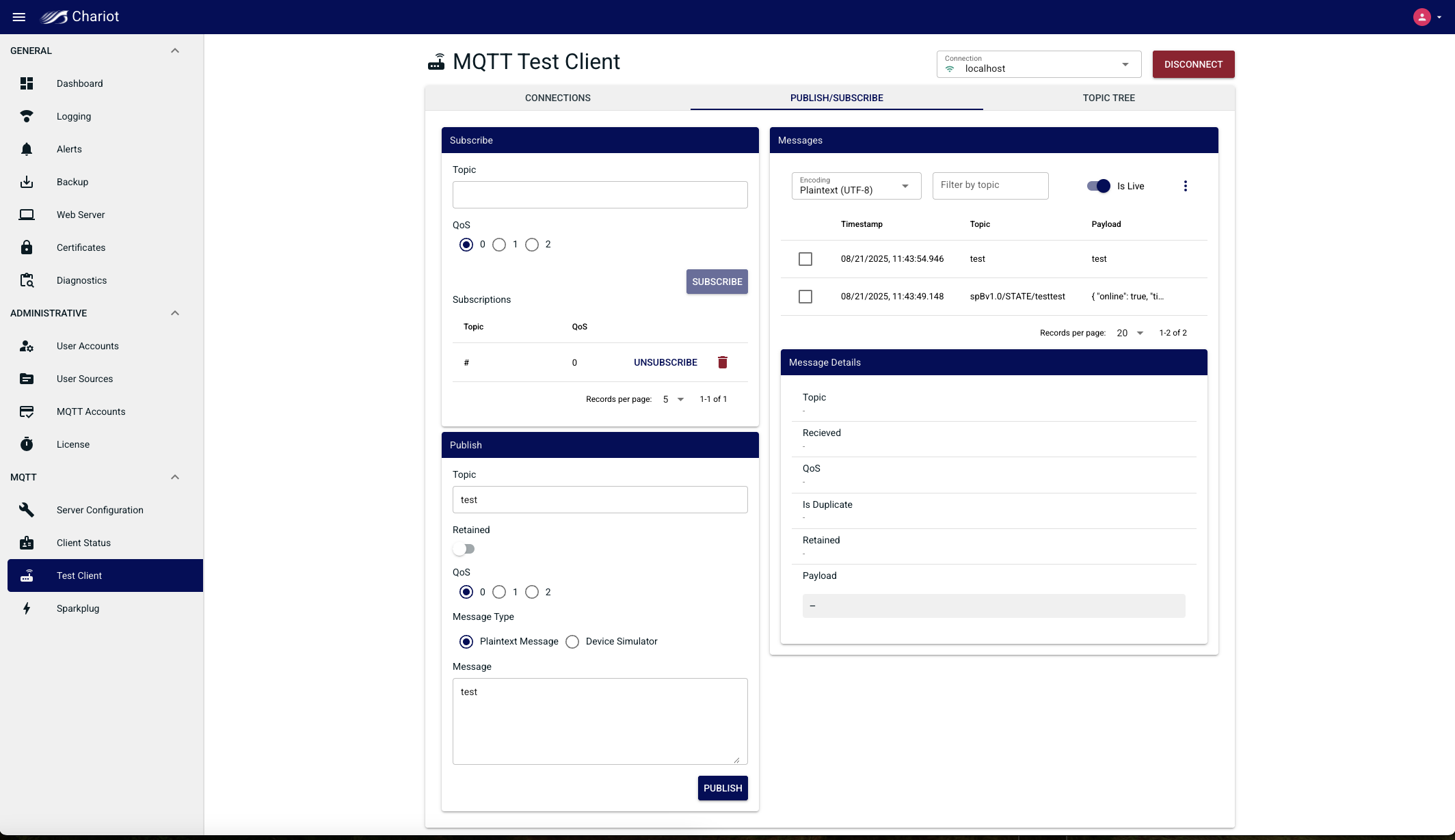 The Chariot MQTT Client is a built-in MQTT application that allows you to connect to any number of MQTT Servers simultaneously, subscribe on any topic(s) across the MQTT servers, publish MQTT messages and view/interact with the MQTT topic tree as messages are published. The application allows for full control of MQTT QoS levels and the retain flag.