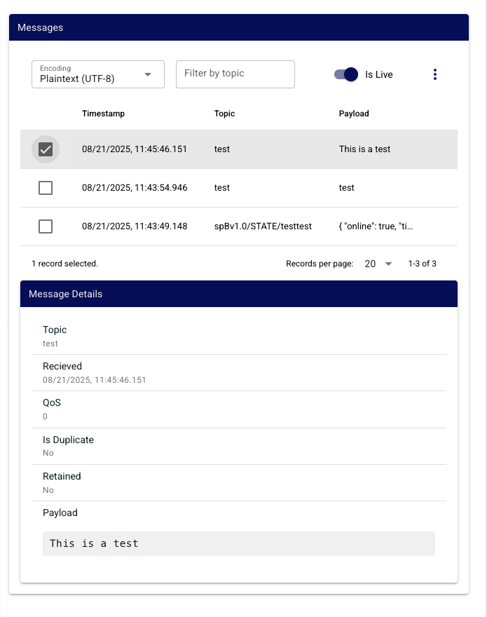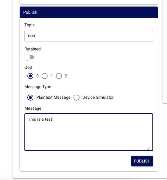 - The Publish/Subscribe tab where you can subscribe on MQTT topics and produce MQTT messages on any topic with a custom payload. The Device Simulator also provides a quick way to get test messages published. The Messages view will decode plaintext, SparkplugB, Hex and Base64.
