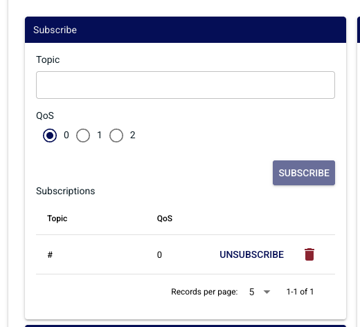 Next, move to the Publish/Subscribe tab to setup your MQTT subscriptions and publish messages if desired. For example, subscribe on '#' in the Subscribe view - set the topic to '#' and click the Subscribe button.