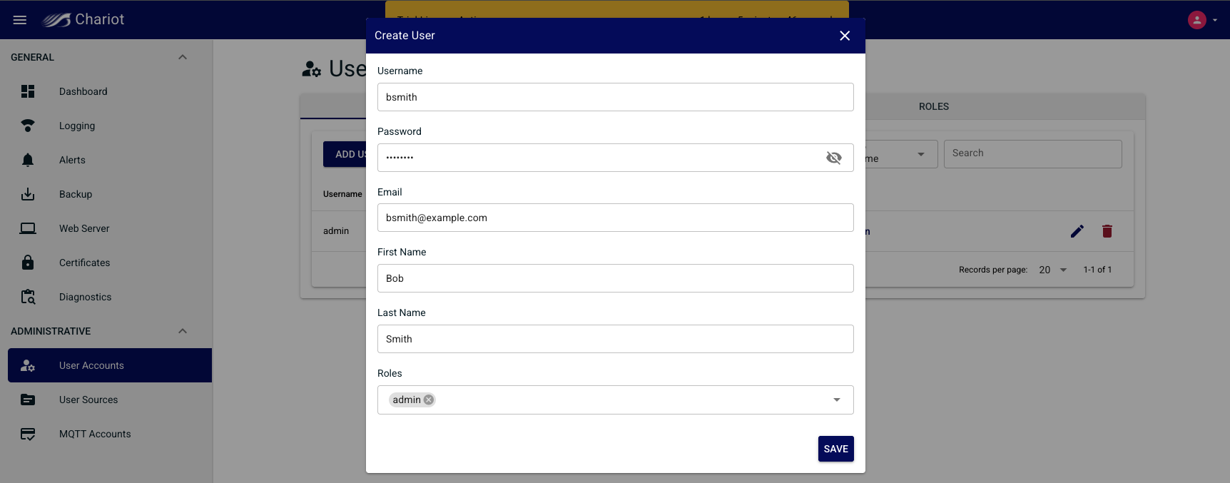 Clicking the "Add User" button will display a modal form for creating a new Chariot User.