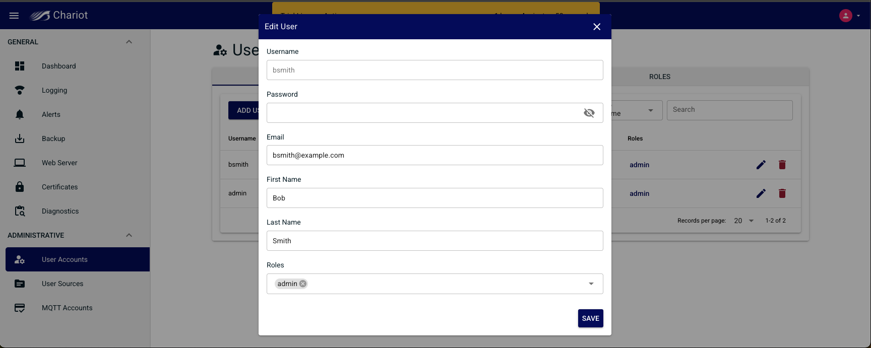 Clicking on the edit icon on a Chariot User in the table will display a modal form for editing the Chariot User.