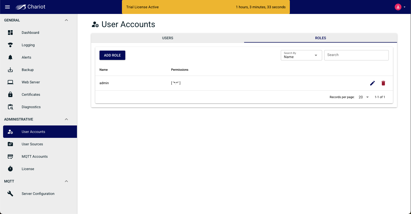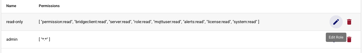 The Roles page allows for the creating, updating, and deleting of Chariot Roles. A Chariot Role is a collection of permissions that authorized viewing, editing and/or controlling the Chariot MQTT Server. The main Chariot Roles page shows a table of existing Chariot Roles. Roles can be added by clicking the "Add Role" button, or they can be edited by clicking on the individual Role in the table.