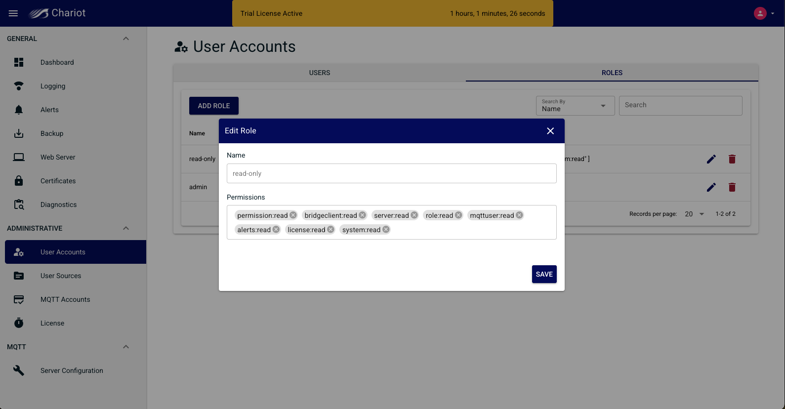 - The permission to perform any actions available from a service within Chariot (such as starting/stopping the MQTT server or activating a license)