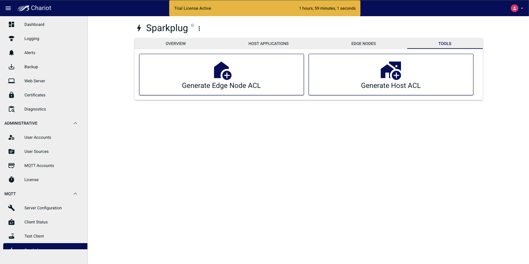 From Chariot release 2.5.0, to avoid manual configuration, the required ACLs can be generated from the Main Navigation → MQTT → Sparkplug → Tools. Clicking one of the available options will provide a modal that will help you automatically generate ACLS to be added to the MQTT Account Credentials.