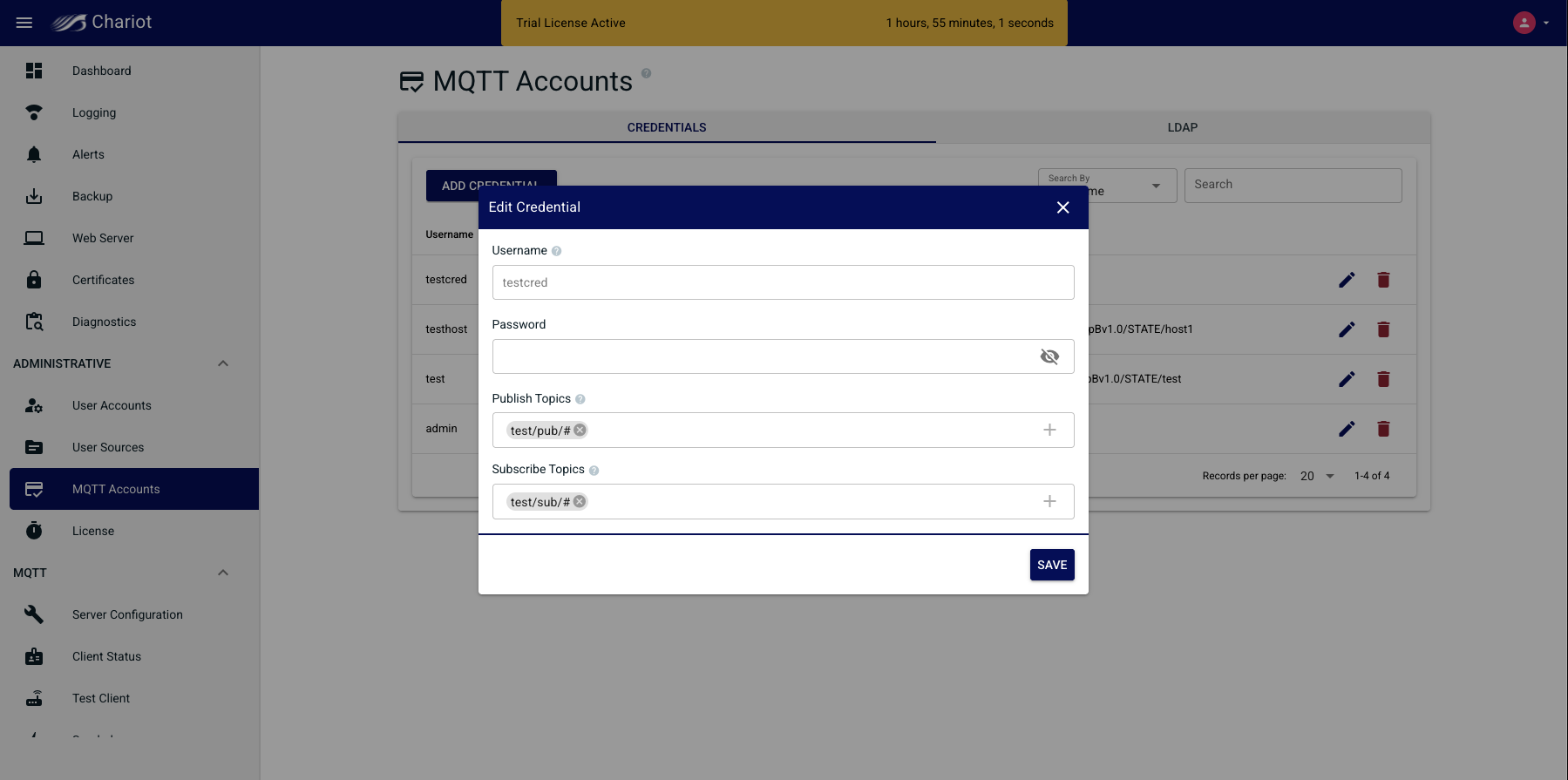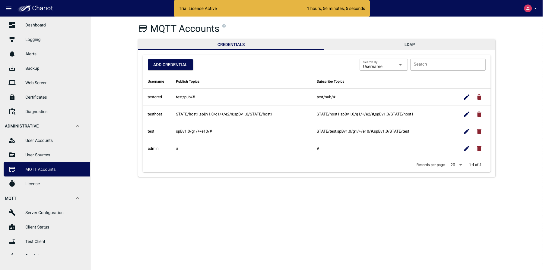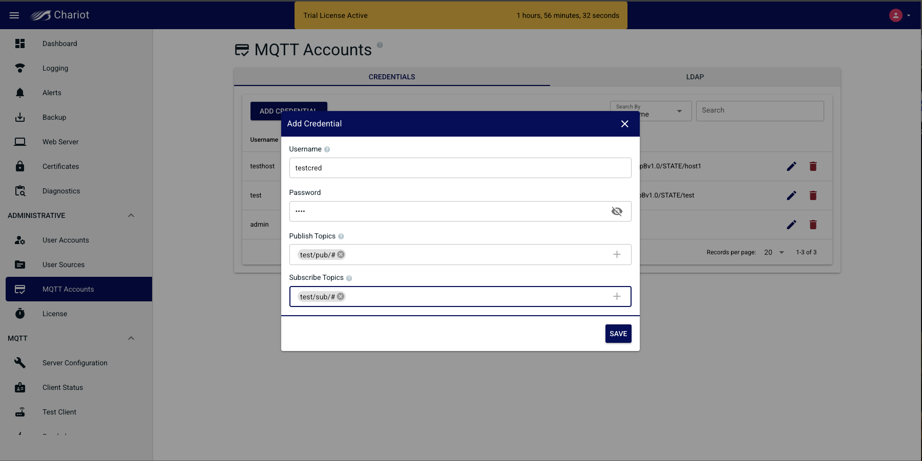 MQTT Account Credentials are the credentials that clients will use to authenticate when establishing an MQTT connection to the Chariot MQTT Server.