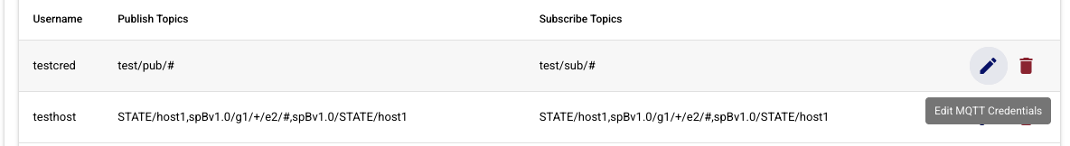 MQTT Account Credentials also contain the access control lists (ACLs) that control which MQTT topics a client can publish and/or subscribe on. MQTT Account Credentials can be added by clicking the "Add Credential" button, or they can be edited by clicking on the individual Credential in the table.