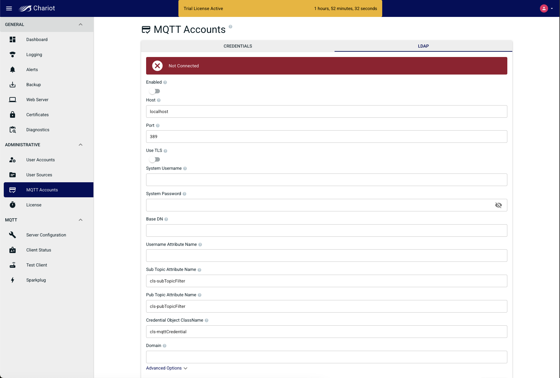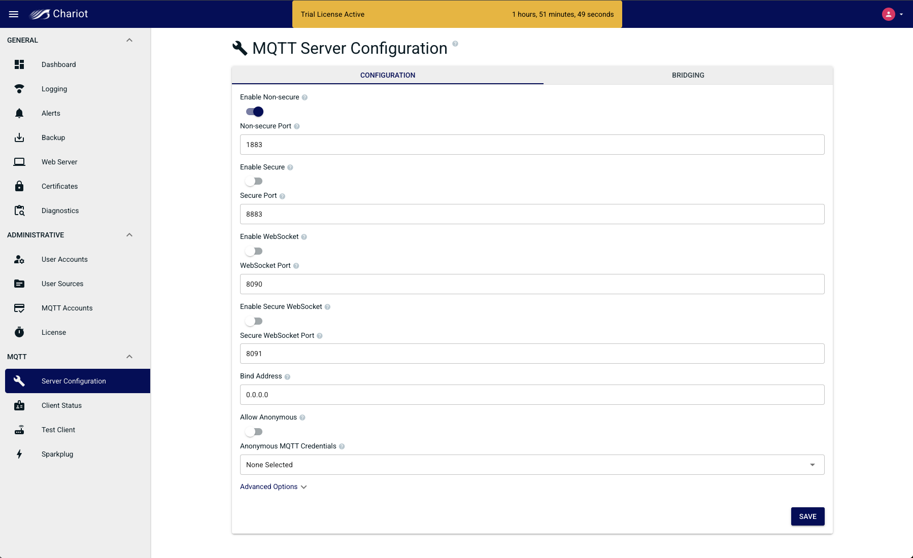 This document describes the configuration options in the Chariot® MQTT Server UI.