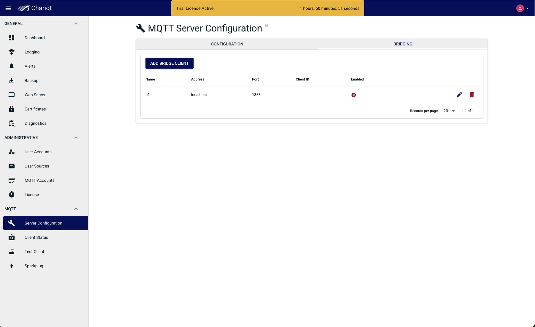 When enabled on Chariot, the Bridge Client becomes an MQTT client to the other MQTT Server. This client publishes messages, flowing through Chariot, to the other broker. It also subscribes on topics with the other broker to receive messages and deliver them to subscribed clients connected to Chariot.