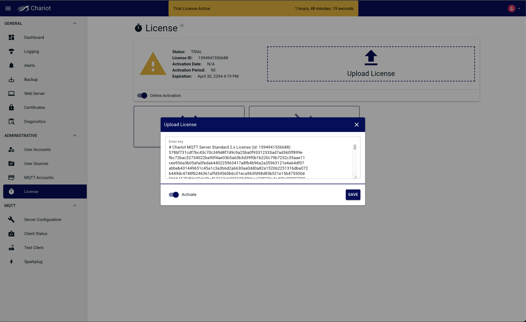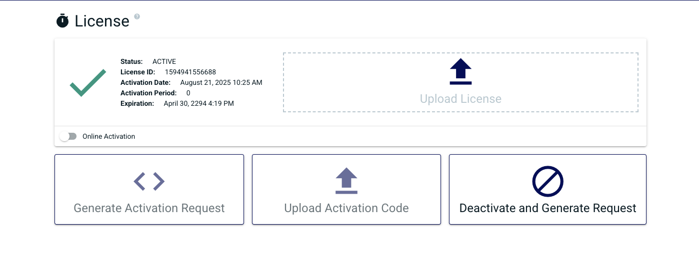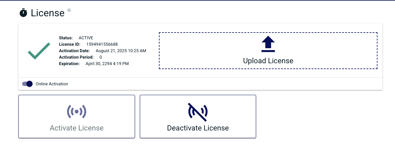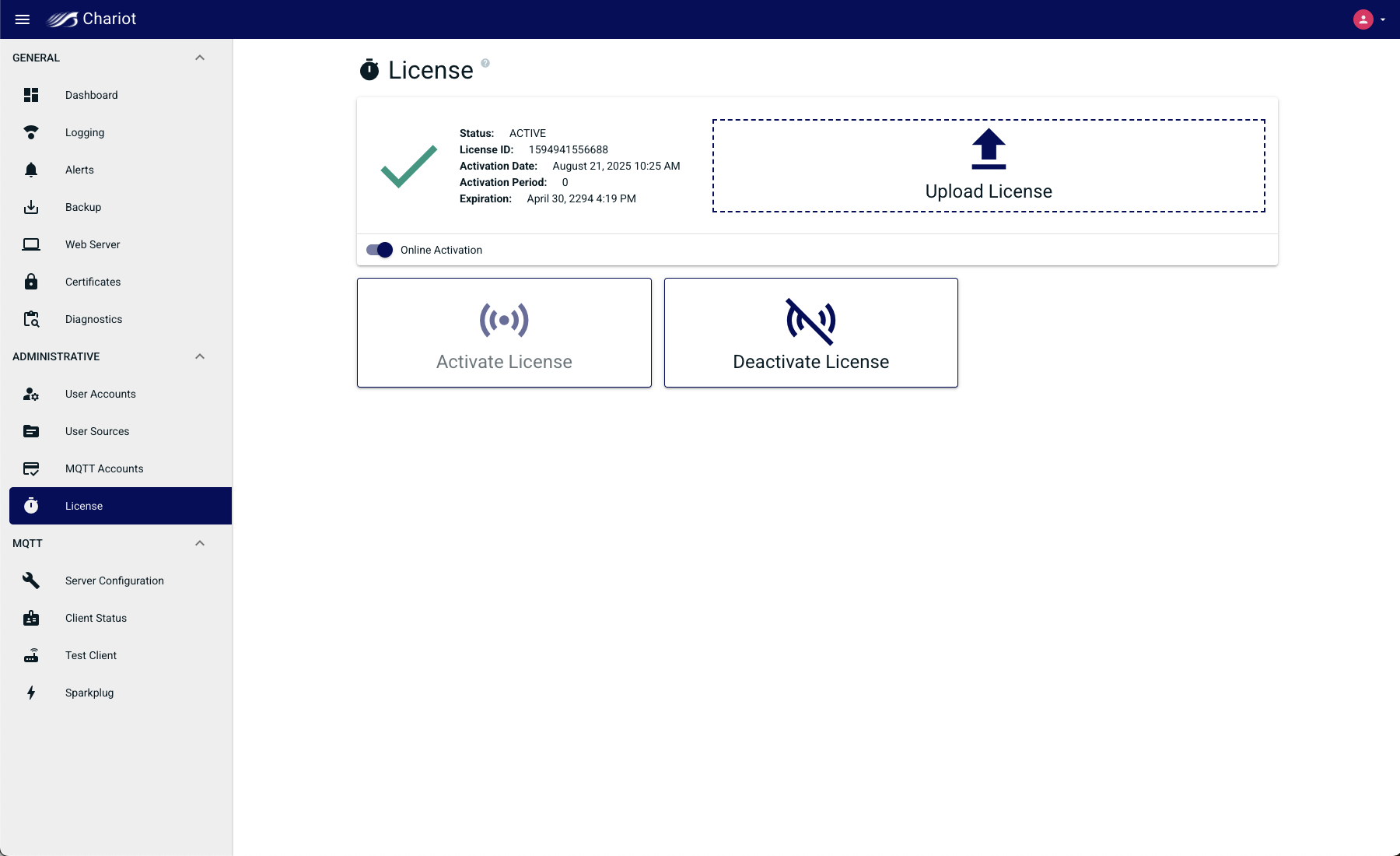 Online Activation allows the Chariot MQTT Server to remotely connect to the Chariot Licensing server for activation and deactivation of Chariot Licenses. When the "Online Activation" is selected, the License page appears with the following options: