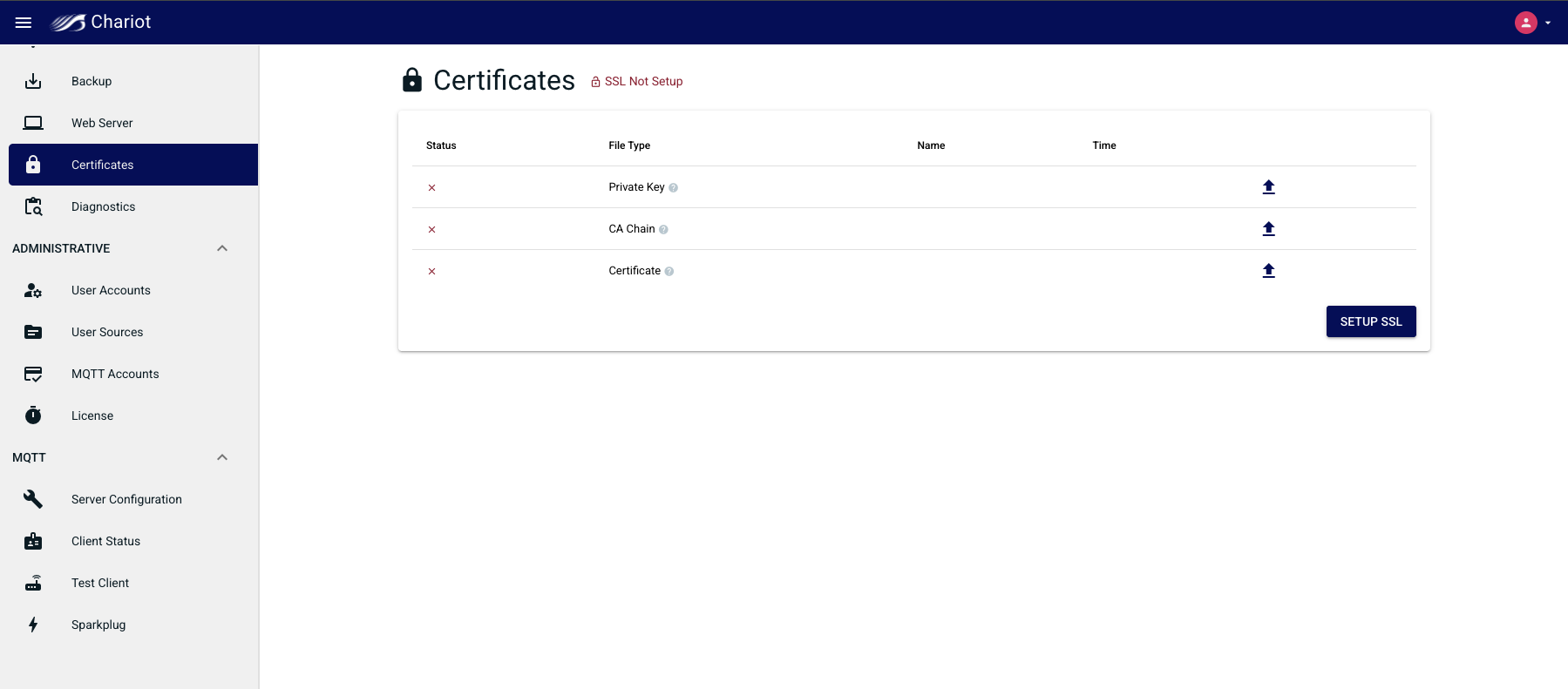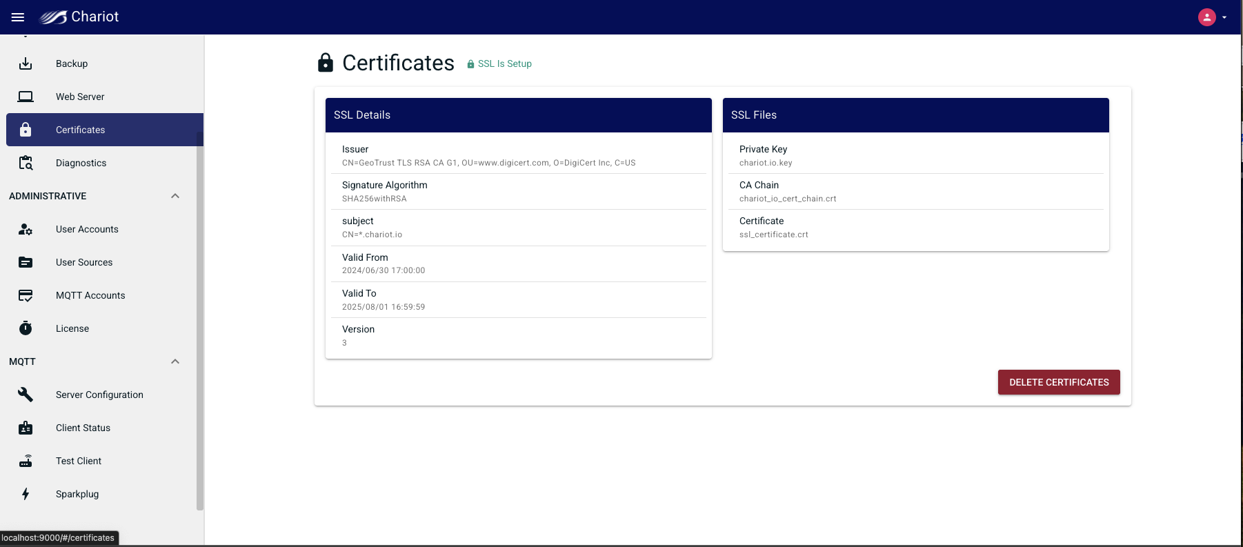 The "Delete Certificates" button can be used to remove the certificate and key from the Chariot MQTT Server and revert to a "SSL Not Setup" state.