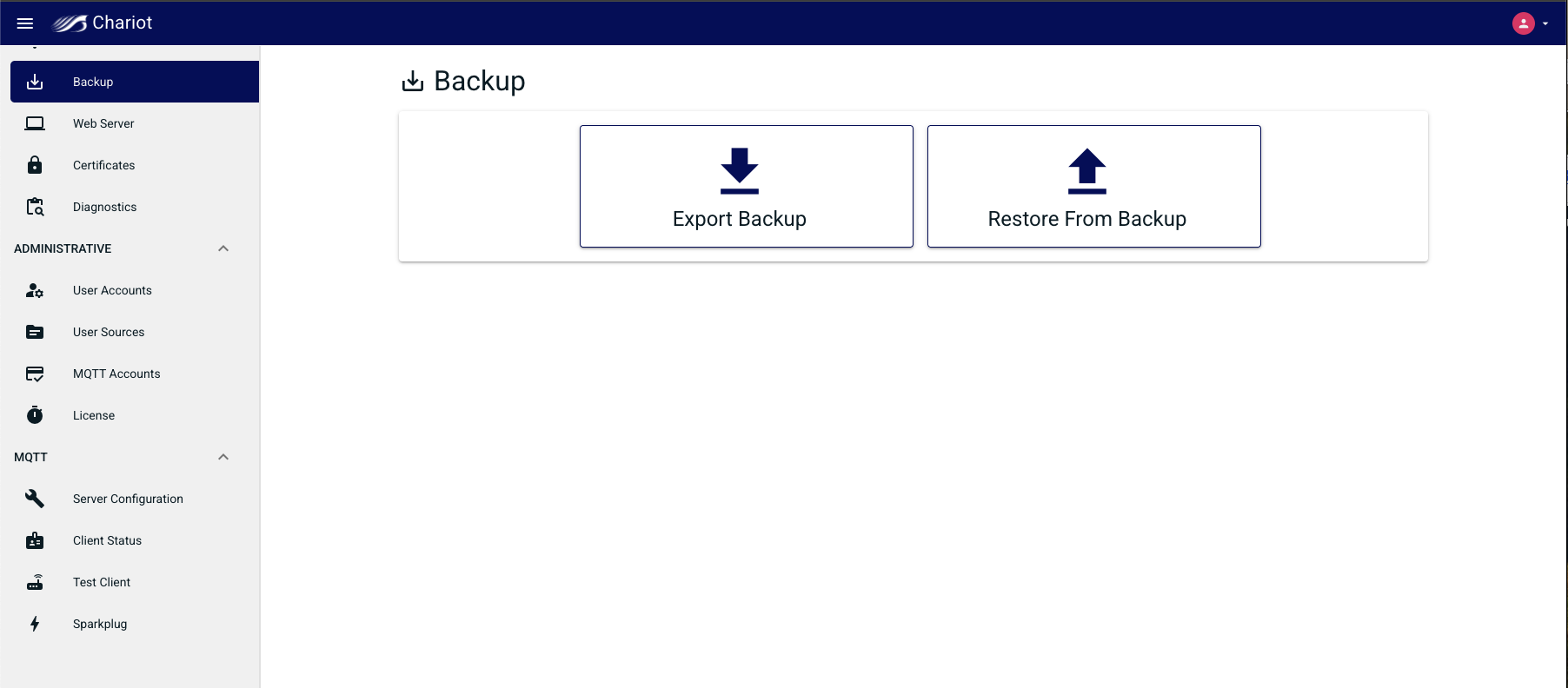 This page allows for the backup and restore of Chariot configuration data.