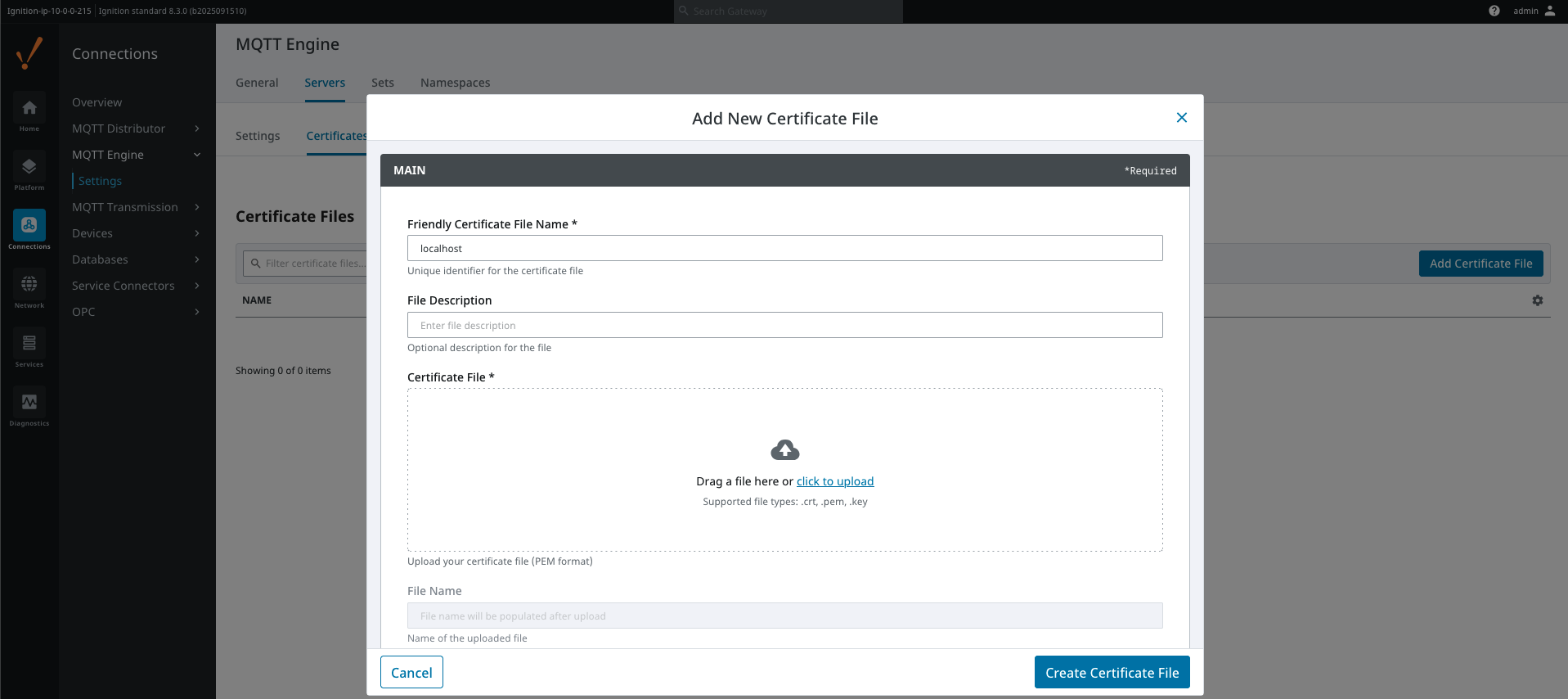 The MQTT Engine and MQTT Transmission modules will both require the CA Certificate chain to be upload and applied. Navigate to the Servers > Certificates section for each module and select Create New Certificate.