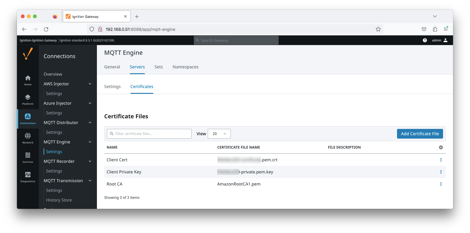 Using the Ignition Gateway Web UI, browse to Connections > MQTT Engine > Settings > Servers' page. Now click the 'Certificates' tab as shown below:
