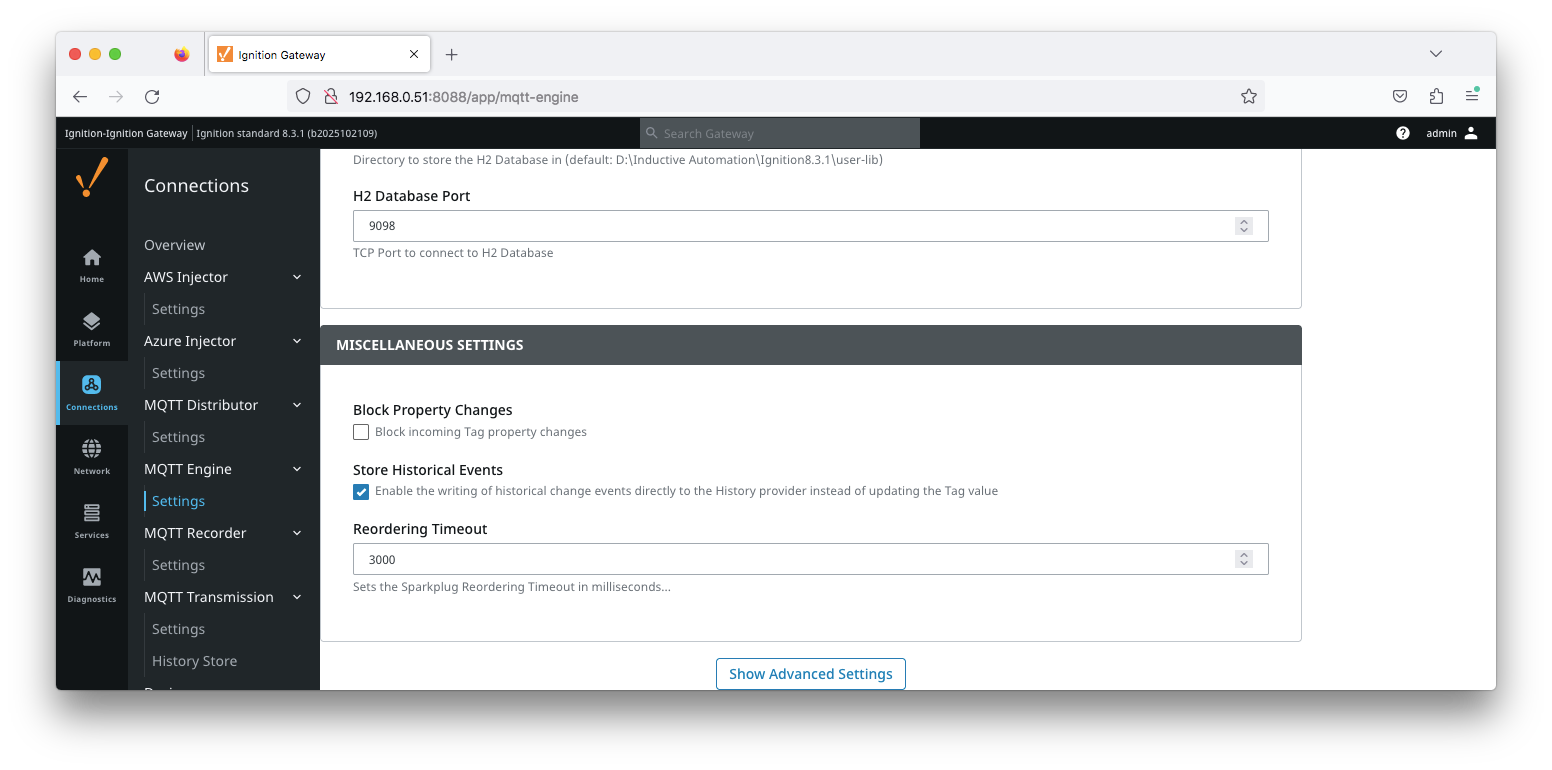 For MQTT Engine, you must also set the Reordering Timeout property due to timing issues related to IoT Core message delivery. To do this, naviagte to the Miscellaneous Settings section on the MQTT Engine General tab as shown below and save the changes.