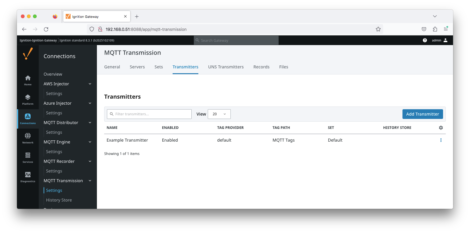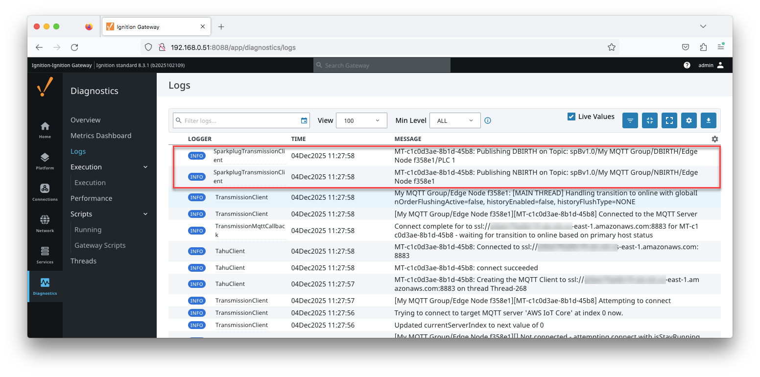 To confirm messages are published from Transmission, navigate to the Ignition logs and Refresh Transmission. This will cause the client to disconnect, reconnect and publish its BIRTH messages.