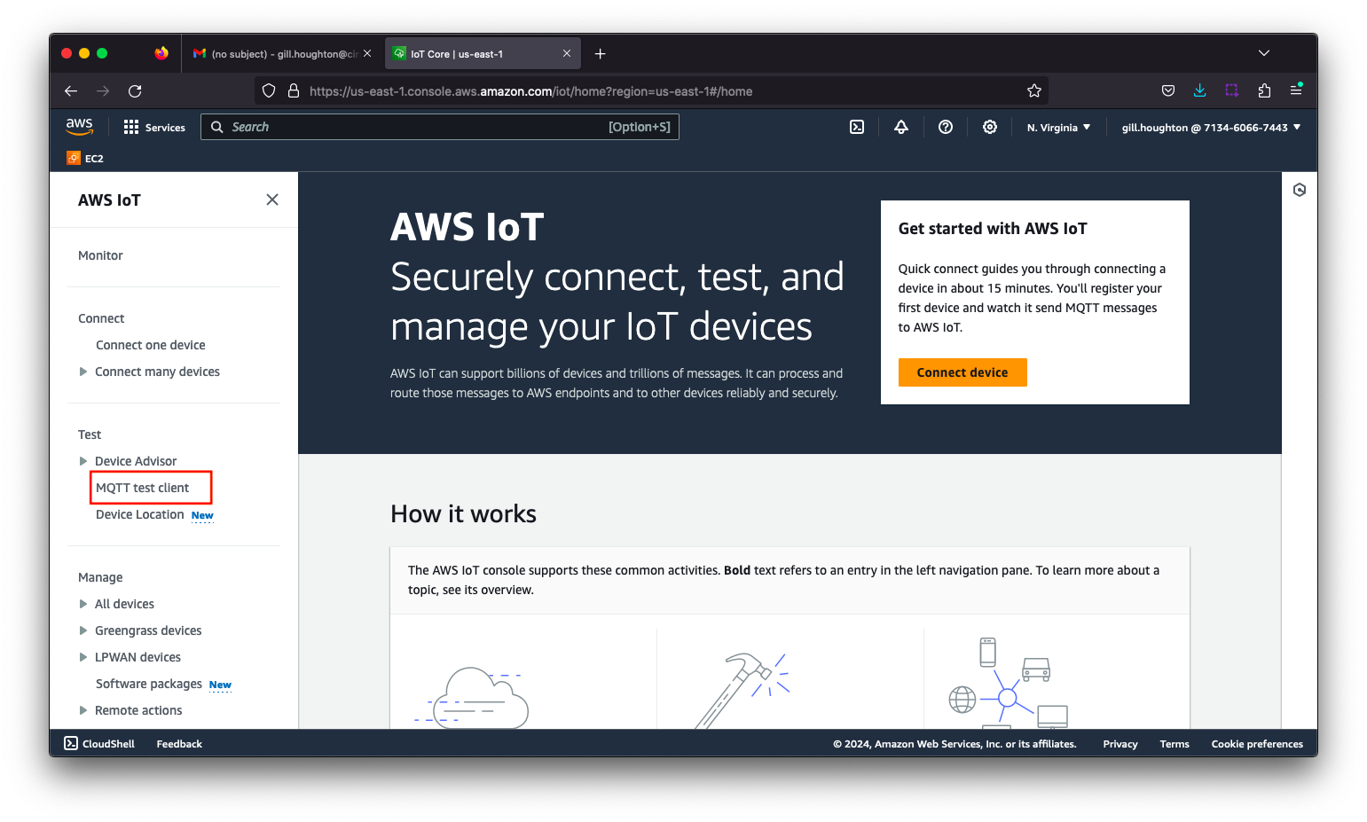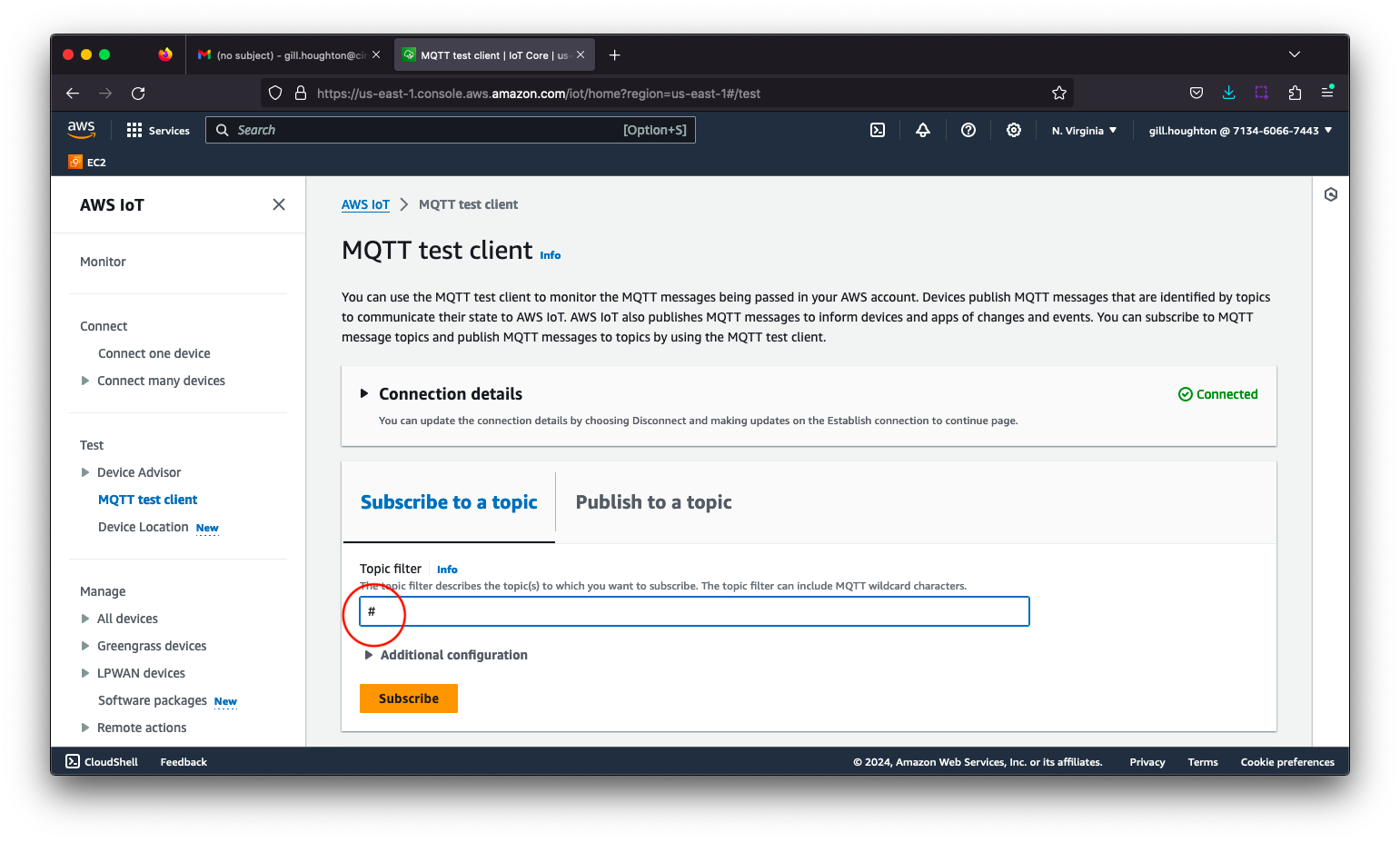 To confirm messages are received as AWS IoT Core. On your AWS account, navigate to AWS IoT > Test > MQTT test client.