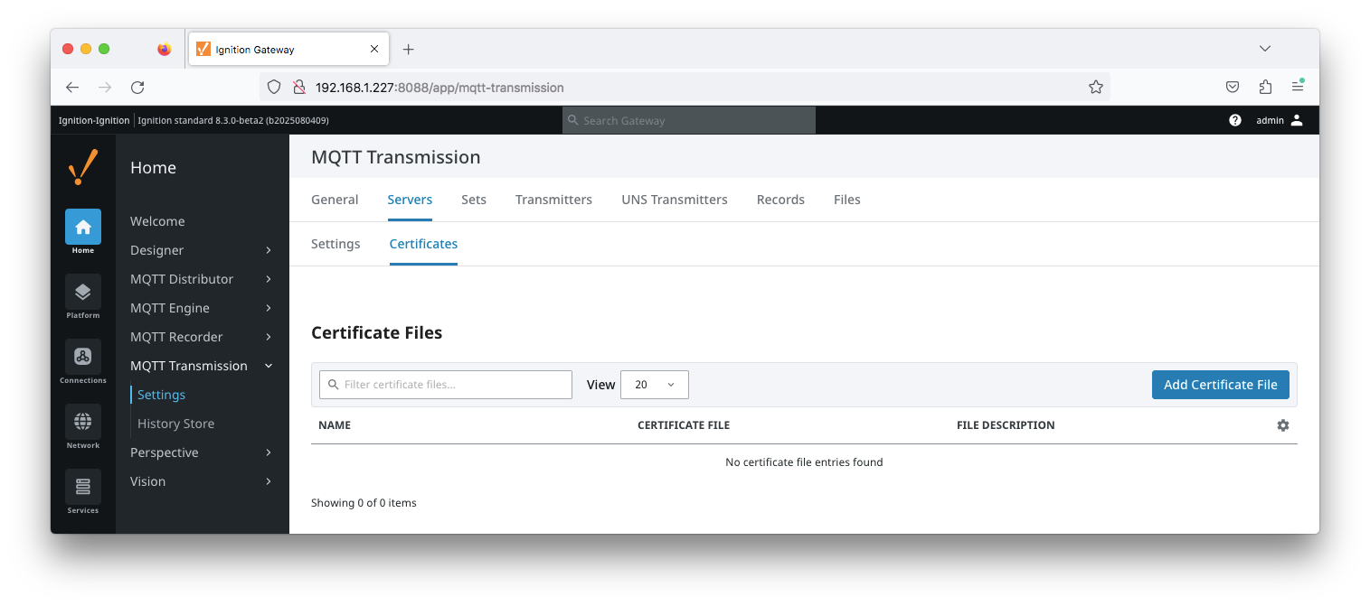 Using the Ignition Gateway Web UI, browse to Connections > MQTT Transmision > Settings > Servers' page. Now click the 'Certificates' tab as shown below: