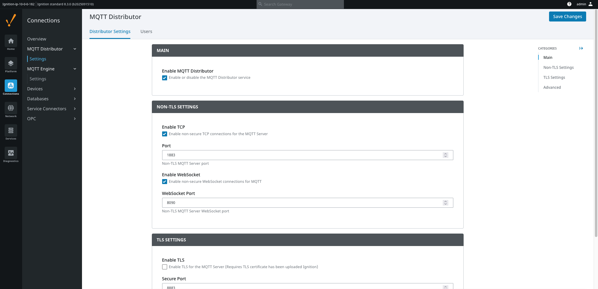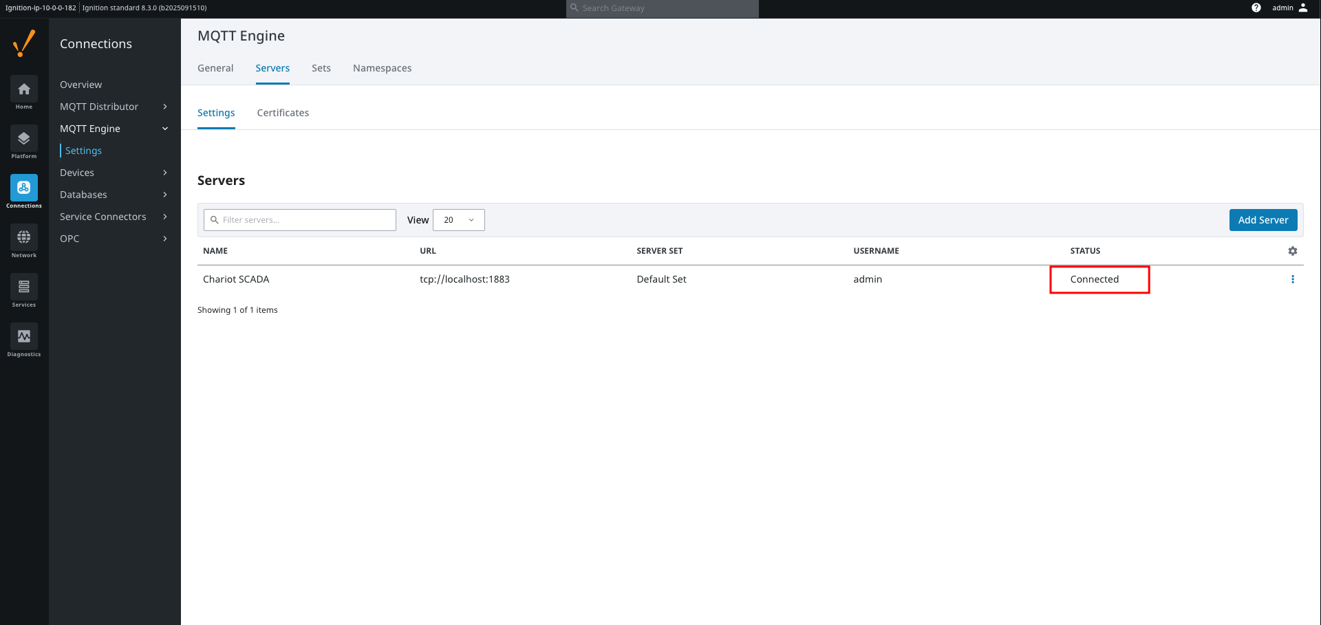 Click on the Servers tab and edit the MQTT Server named Chariot SCADA to modify the URL to point to the Ignition Distributor gateway. Example: If your Gateway IP is 10.1.10.97 then set the URL to tcp://10.1.10.97:1883 and Save Changes.