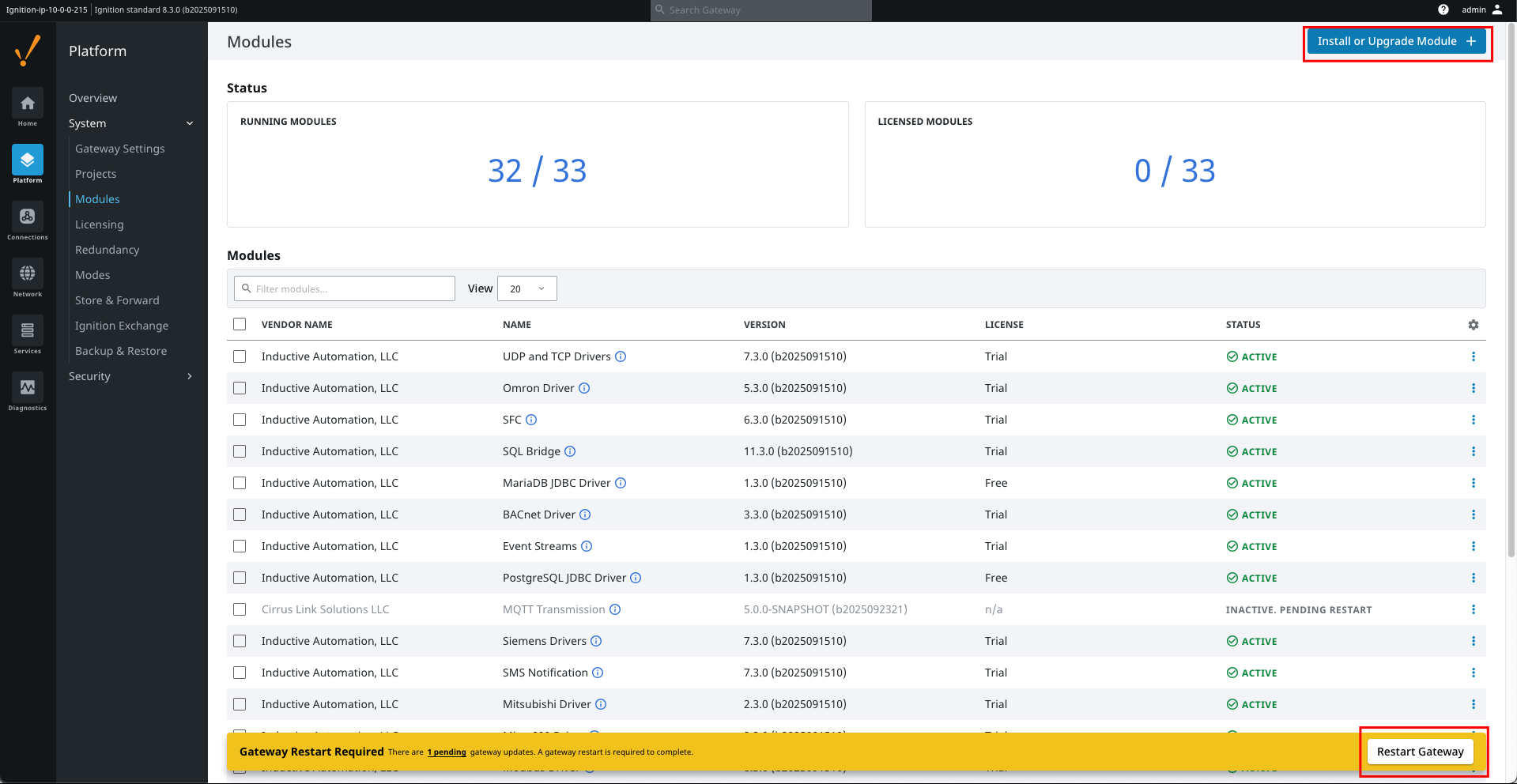 When complete, the Ignition Gateway will display a bar across the bottom prompting a restart. Restart the gateway and the modules will be ready for use: