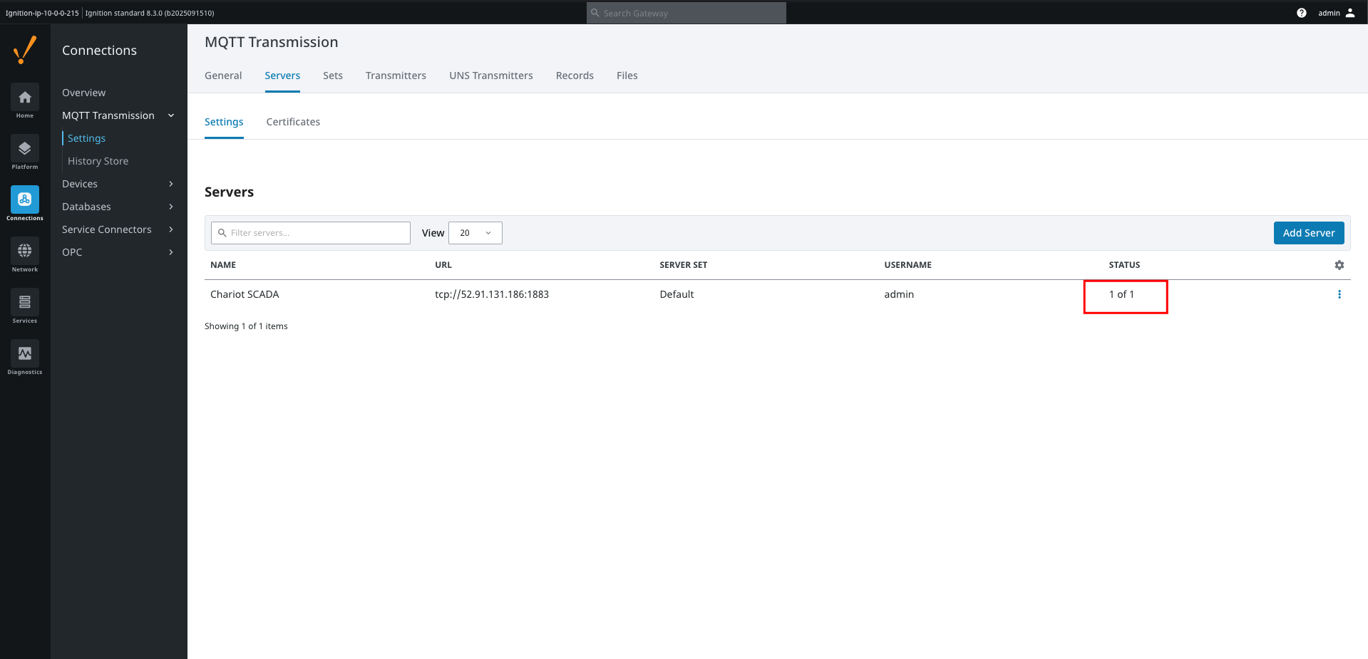 Once configured, MQTT Transmission will automatically connect, and you can confirm by checking the Connected status on the Servers tab.