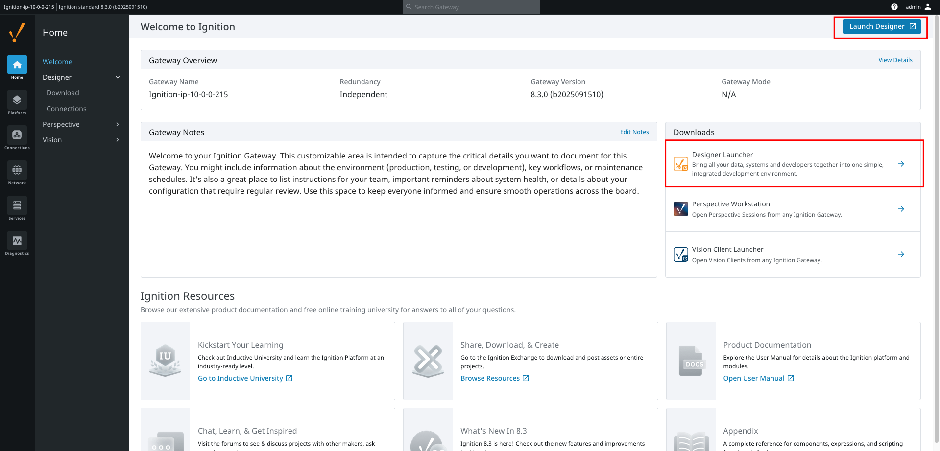 Select the Get Designer button from Ignition web portal to download, install and launch the Design Launcher.