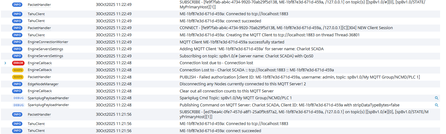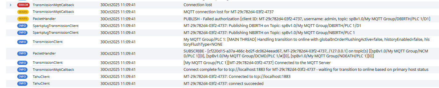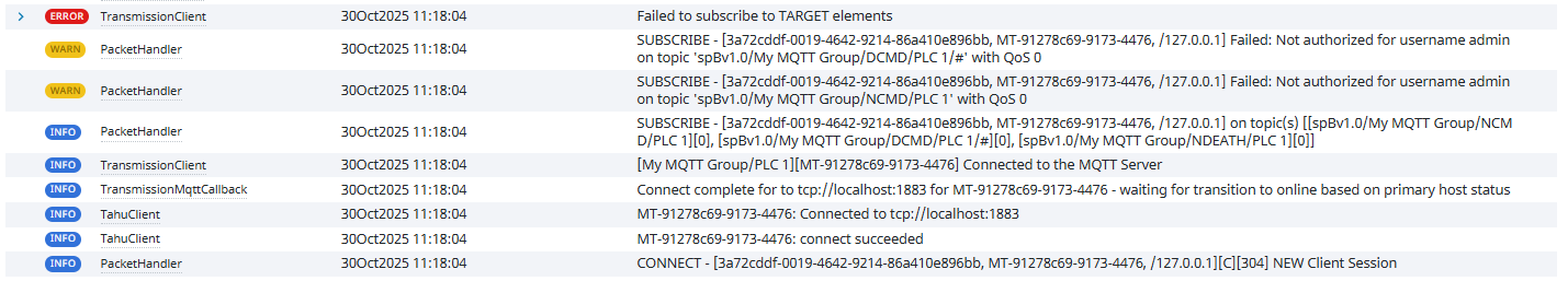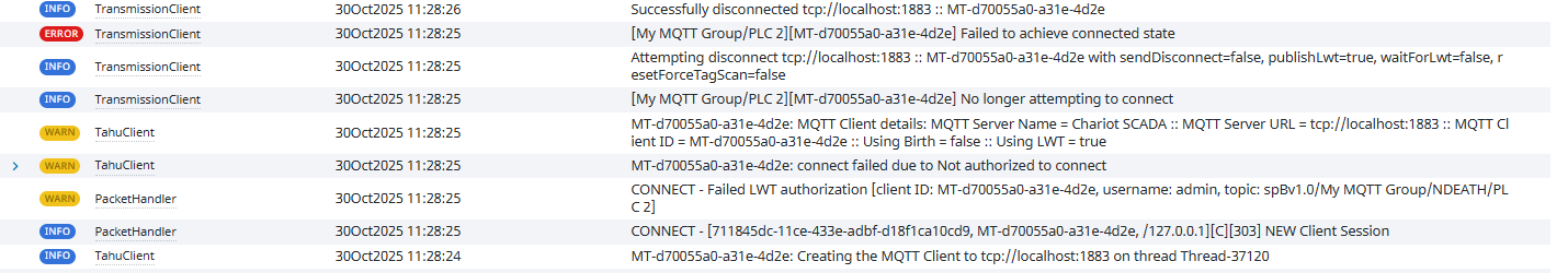 With the following ACL, the Transmission client My MQTT Group/PLC 1 is able to connect and subscribe but client My MQTT Group/PLC 2 is not authorized to connect with the LWT of spBv1.0/My MQTT Group/NDEATH/PLC 2.