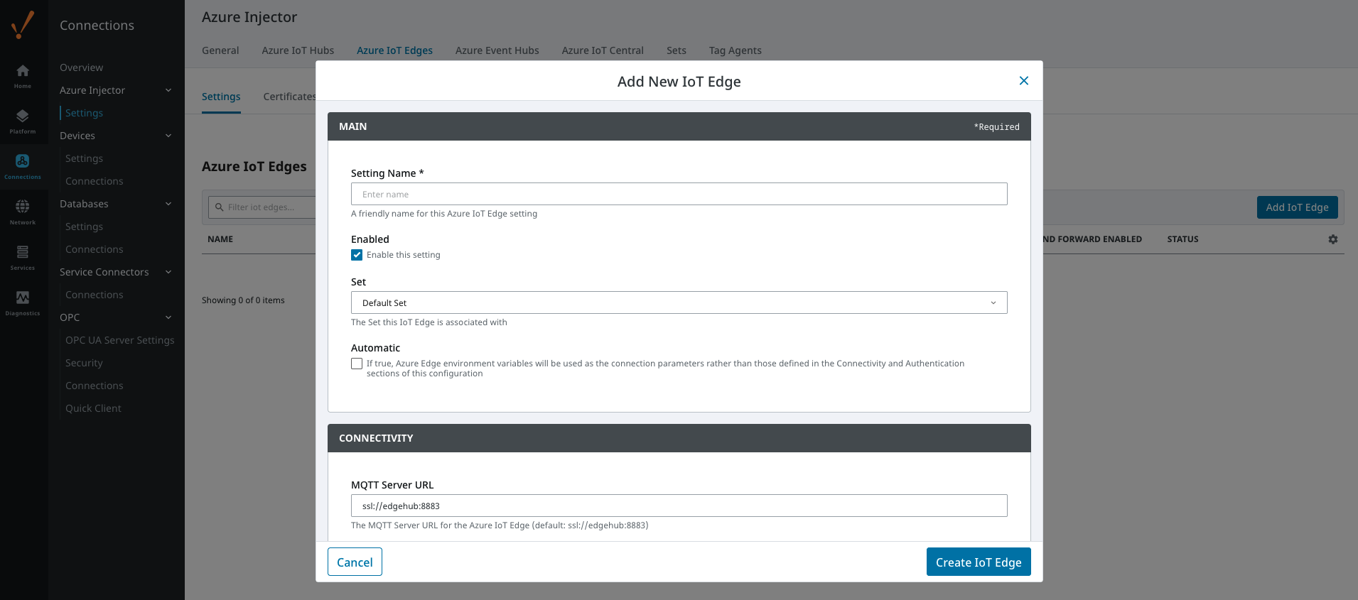 Now select the 'Settings' tab directly to the left of the 'Certificates' tab. Then click the 'Create new Azure IoT Edge Setting...' link. This will open the following page.