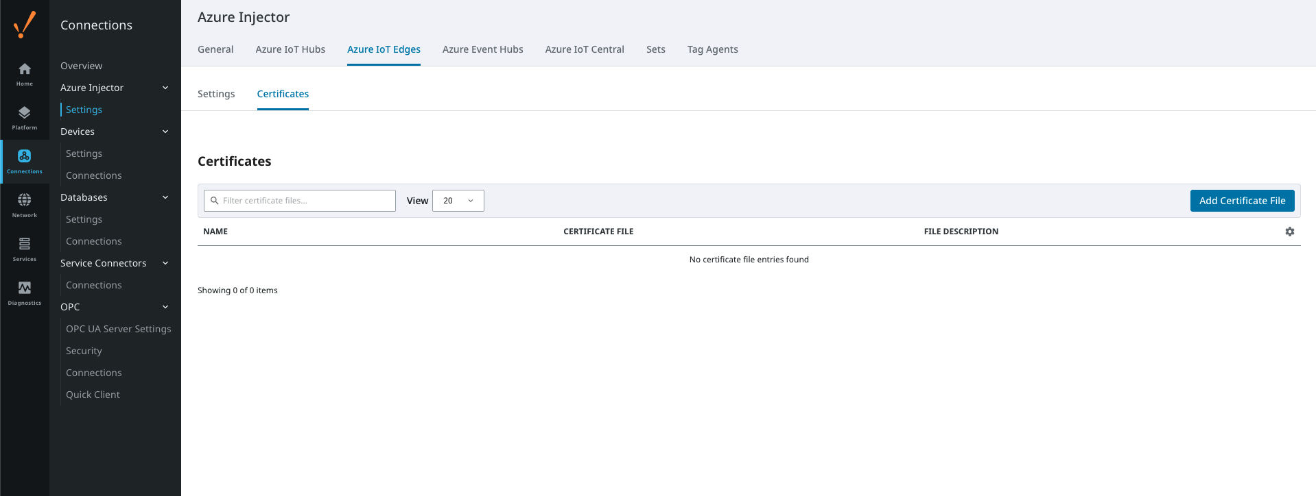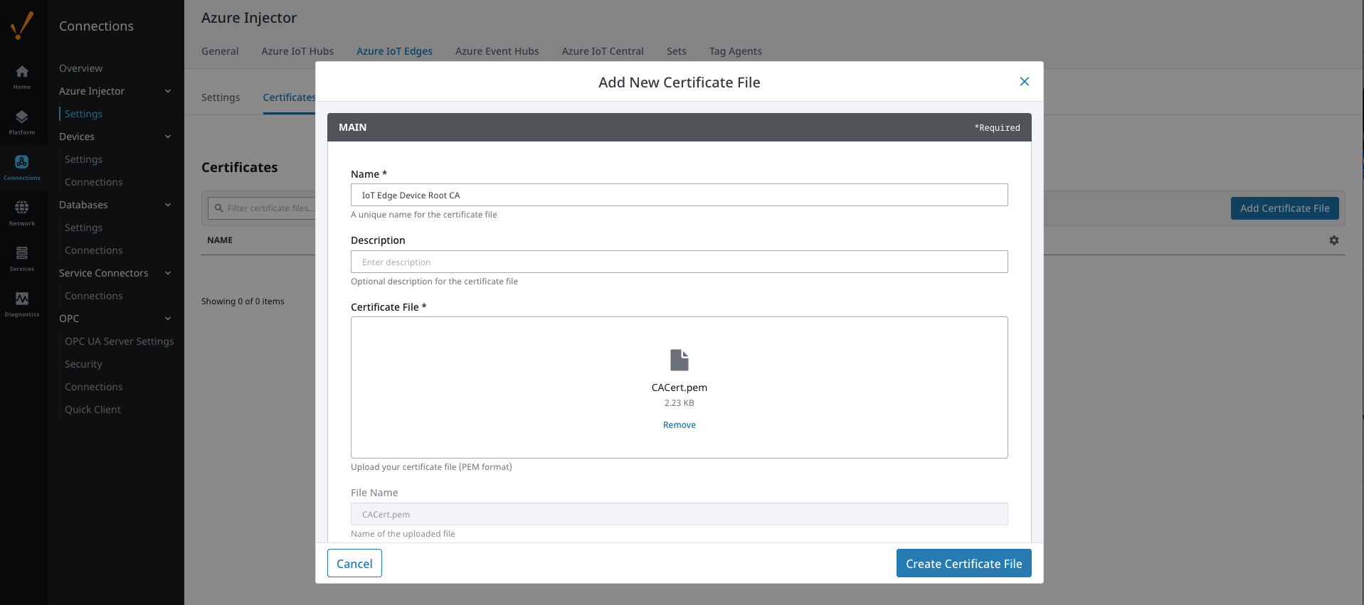 Click 'Create new Certificate'. Then browse to the Azure IoT Edge Device Root CA that you provisioned during the installation and configuration of the Azure IoT Edge Device. Give it a friendly name as shown below.