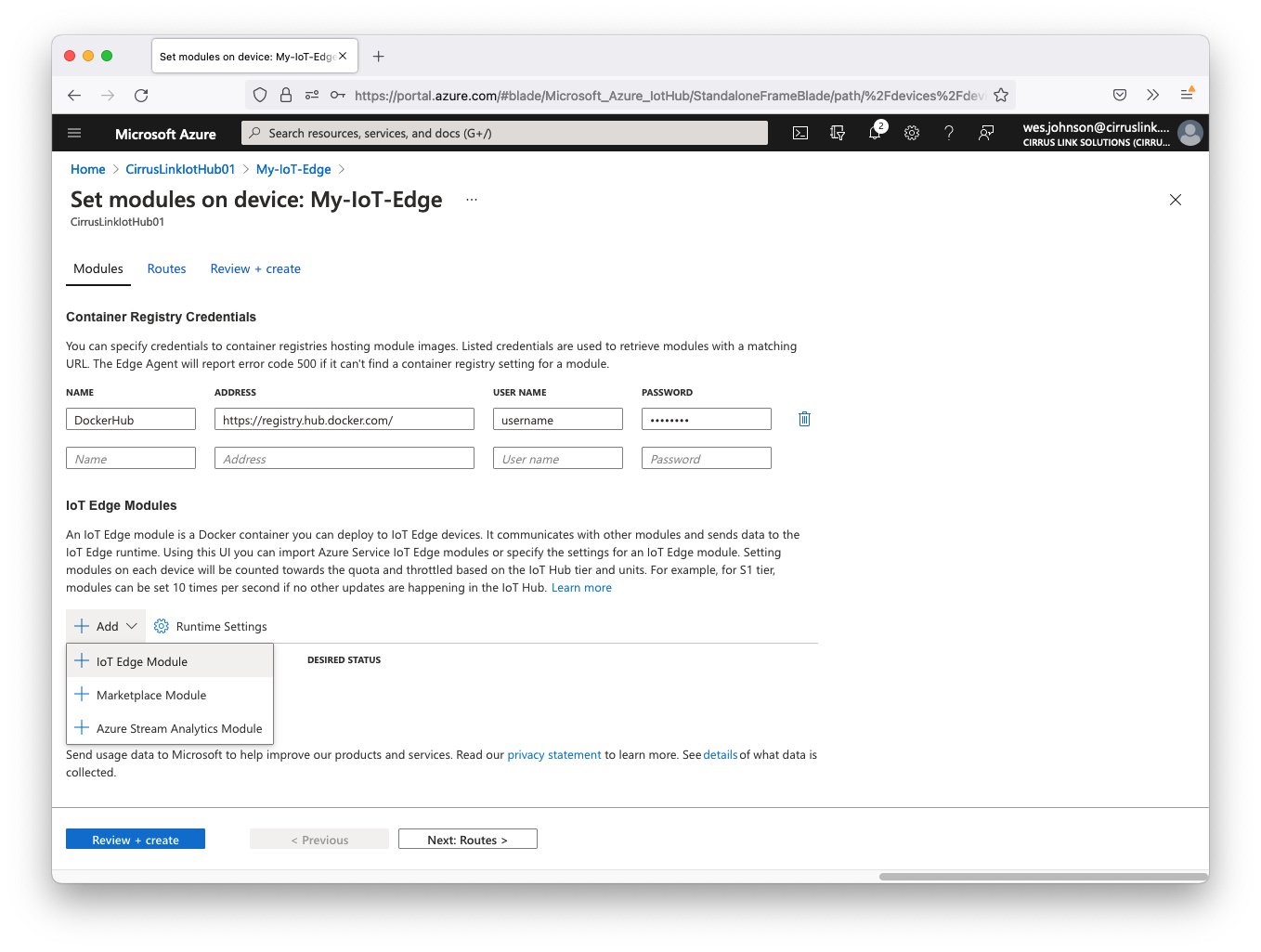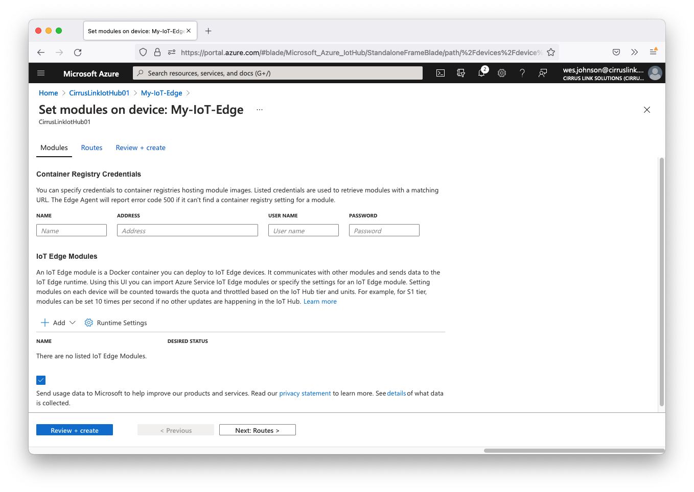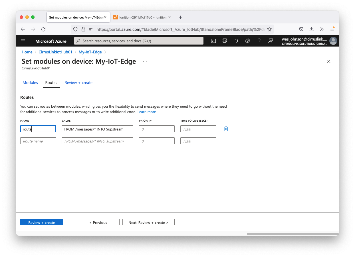 Leave the default route in place. This will allow messages to flow from Azure IoT Edge Hub to Azure IoT Hub. This feature will be used later in this tutorial.