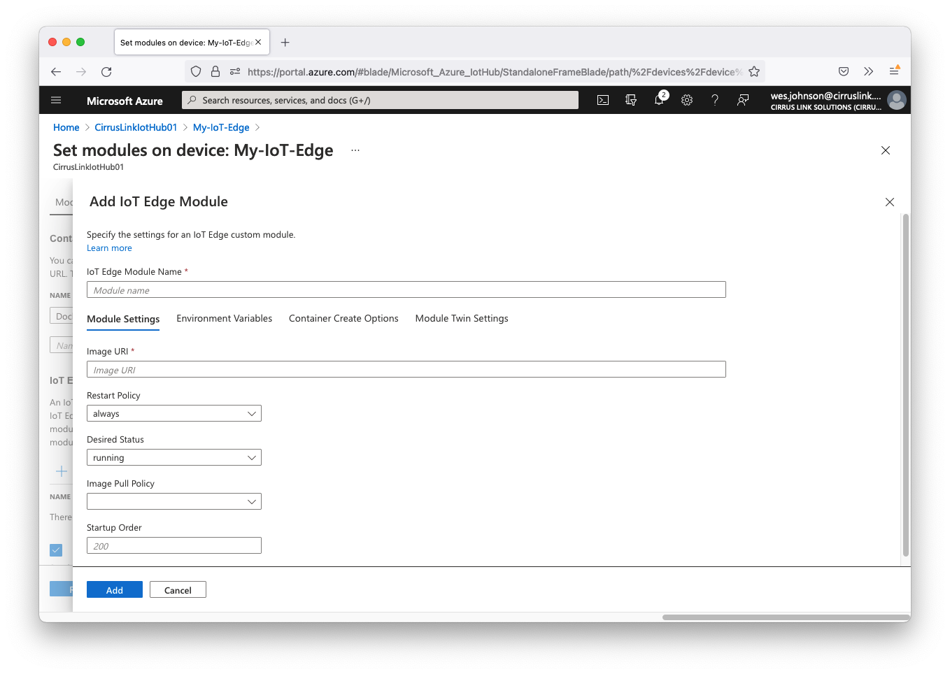 Now click the '+ Add' drop down under 'IoT Edge Modules' and select 'IoT Edge Module' as shown below.