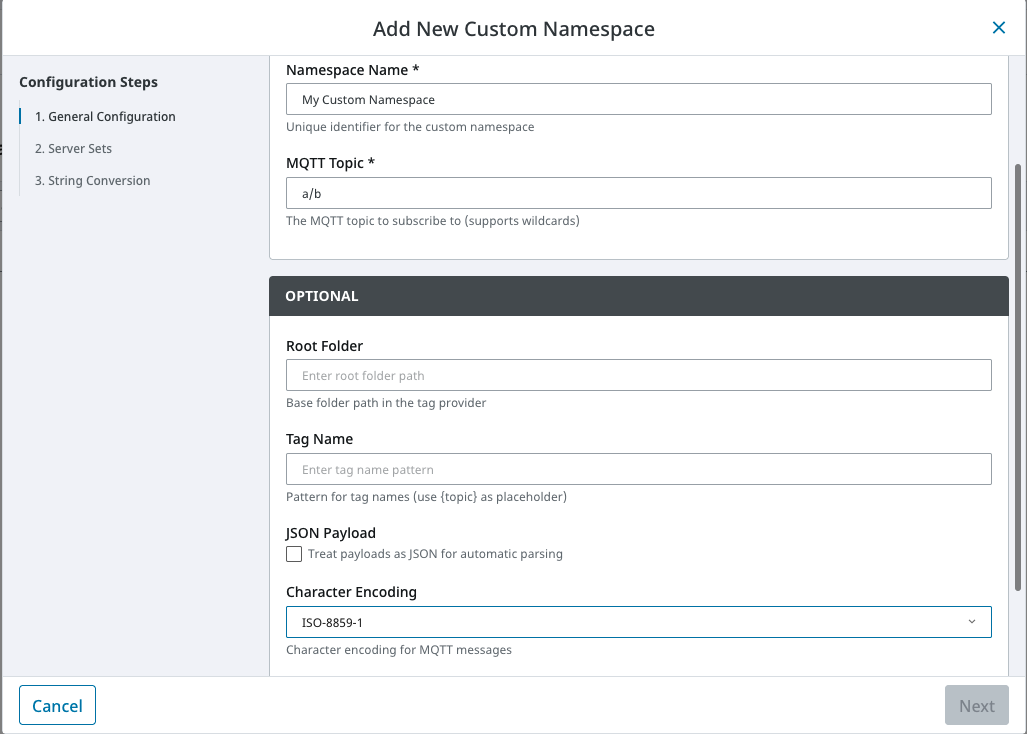From the left hand menu bar, navigate to Connections > MQTT Engine > Namespaces > Custom and setup an custom namespace as shown below setting the Encoding Charset to ISO_8859_1: