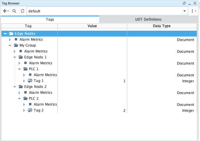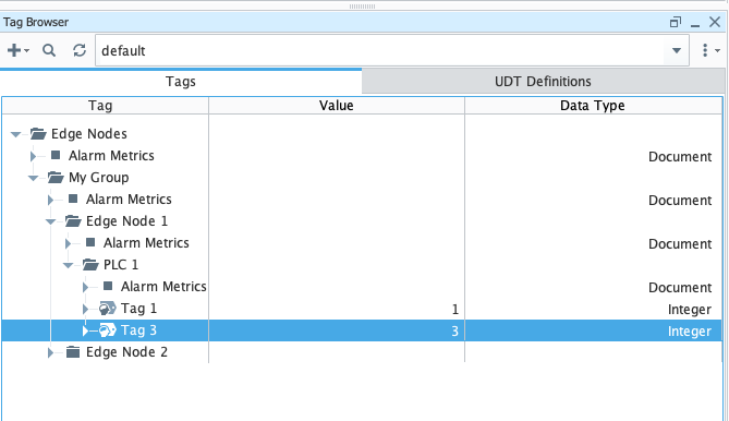 This Transmitter will look in the '[default]Edge Nodes' folder for tags to publish via MQTT. Because no Sparkplug IDs are defined in the Transmitter configuration, the first folder under the 'Edge Nodes' folder will be the Sparkplug Group ID. The second level folders will be the Sparkplug Edge Nodes IDs. So, given the following tag tree: