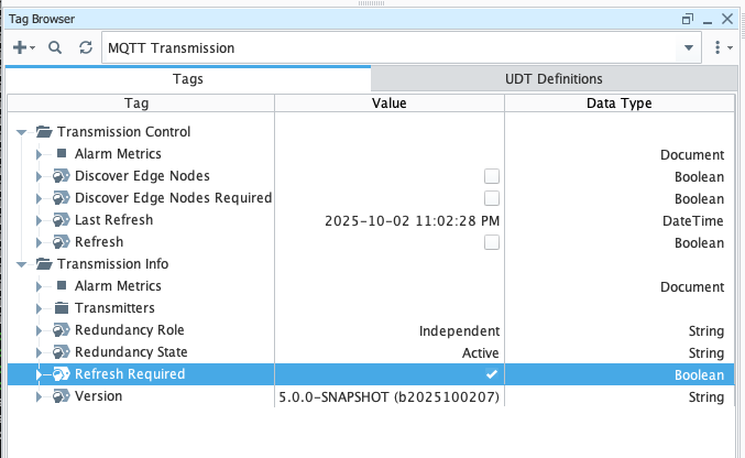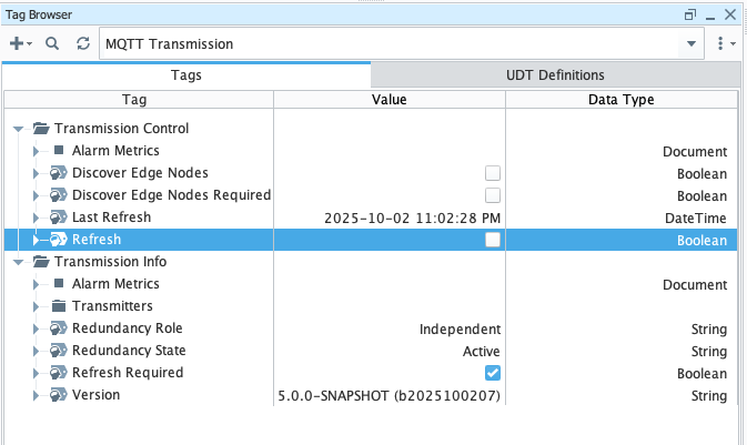 Now browse back to the MQTT Transmission tag provider and you will see the 'Refresh Required' boolean tag now shows 'true'. This is because a new tag was added which means a new BIRTH sequence must be published for consumers of the messages (such as MQTT Engine) so they can pick up the tags.