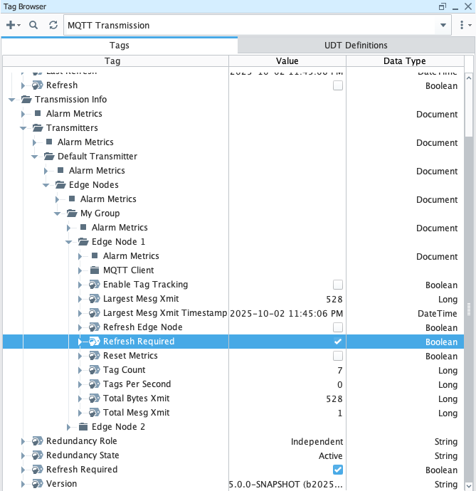 Now that the Global Refresh Required boolean is true as is the 'Edge Node 1' Refresh Required is also true. This is because we added a tag under the 'Edge Node 1' Edge Node. As a result, 'Edge Node 2' doesn't actually need to be refreshed. So, at this point we can write a true to the '[MQTT Transmission]Transmission Info/Transmitters/Default Transmitter/Edge Nodes/My Group/Edge Node 1/Refresh Edge Node' tag. In doing so, only the tag tree associated with 'Edge Node 1' is rescanned. Also as a result, only the BIRTH sequence associated with 'Edge Node 1' will be published. After performing this refresh, the Global Refresh Required tag as well as the 'Edge Node 1' specific Refresh Required tag should go back to false denoting that everything is up to date. This is shown below.