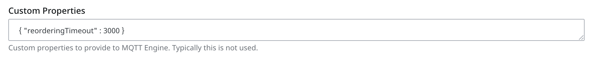- On the MQTT Engine 'General' configuration tab, under the Advanced section, set 'Custom Properties' to be the following string: { "reorderingTimeout" : xxxx } where xxxx represents the timeout in milliseconds. For example, the configuration below sets the reorderingTimeout to 3 seconds