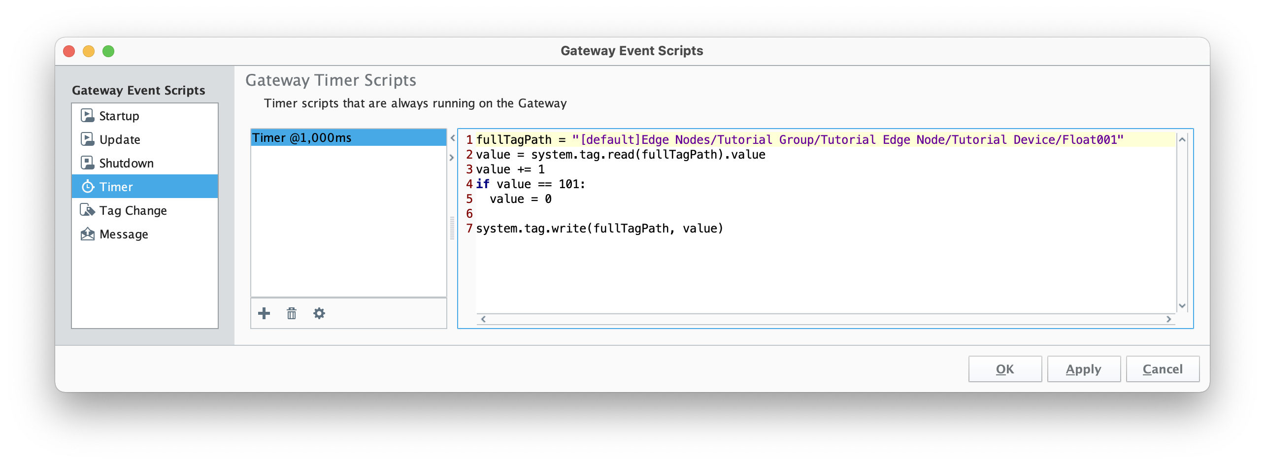 Now in Ignition Designer, create a Gateway timer script as shown below. This is a simple script that will automatically change the value of the Float001 tag every second. Also, for copy and paste convienenceconvenience, the code is below as well.