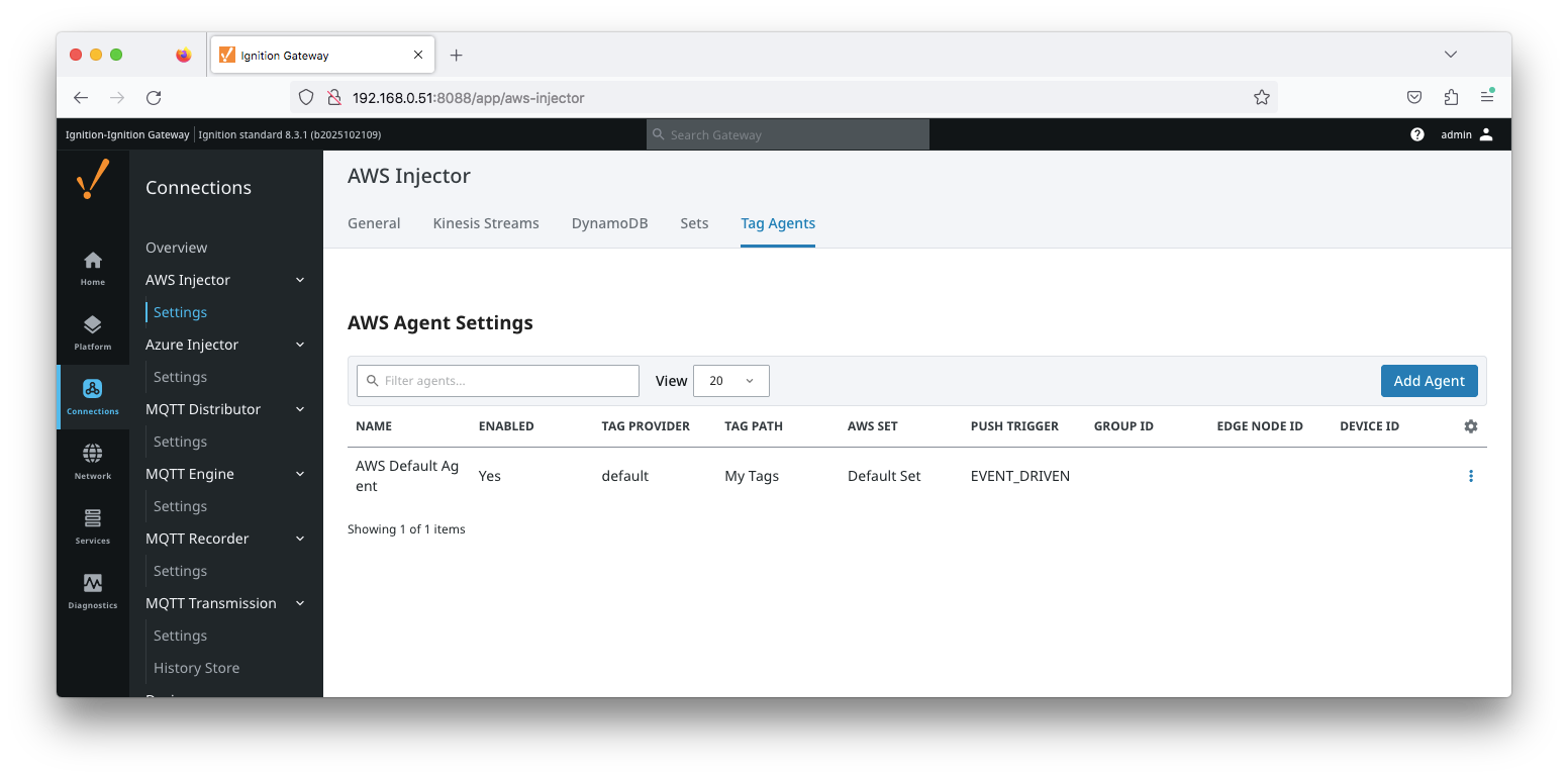 Tag Agents define what tags will be picked up in the Ignition tag tree and pushed to the defined cloud service. Tag Agents are very similar to MQTT Transmission 'Transmitters' in terms of how they interact with the Ignition Tag Tree. The 'Tag Provider' and 'Tag Path' configuration options define where in the Ignition Tag Tree the Agent will look for tags. There are also configuration options for the Sparkplug Group, Edge Node, and Device ID.