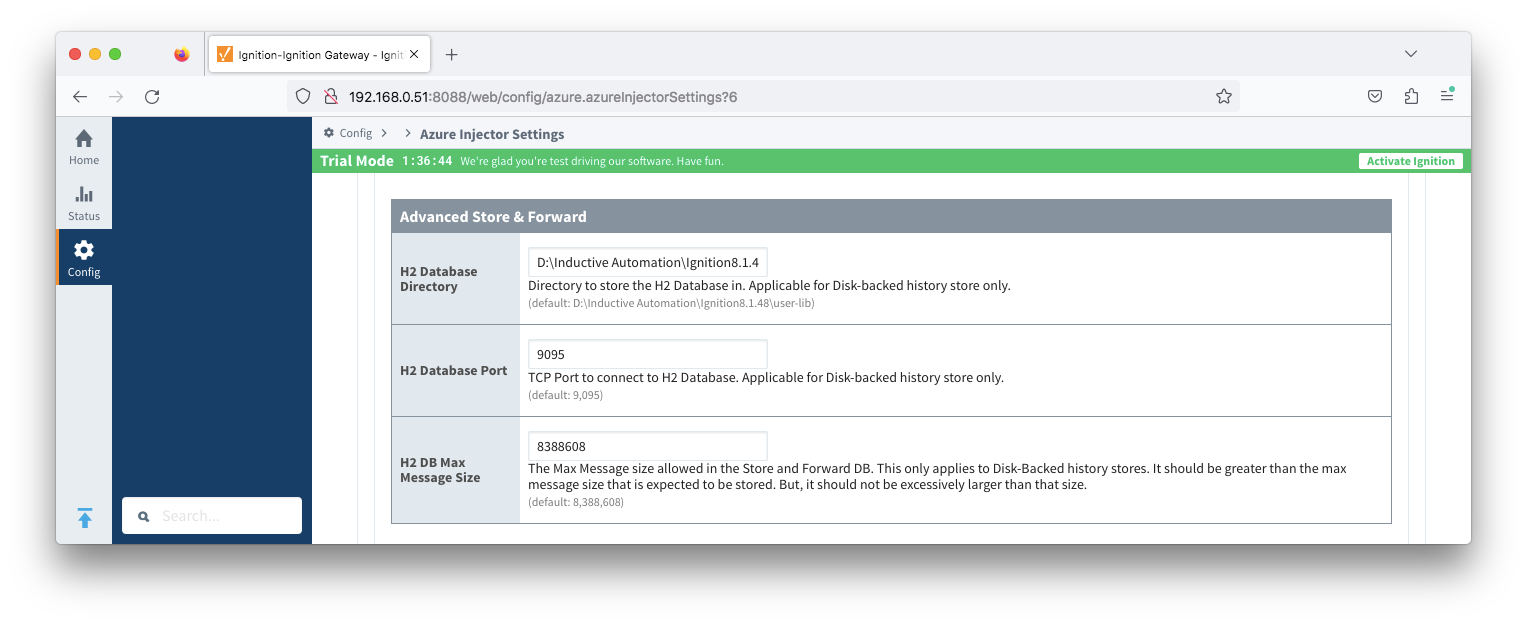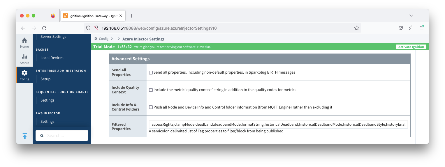 The configuration for this module are located under the Configure tab of the Ignition Gateway web UI in the left hand navigation pane under 'Azure Injector Settings'.